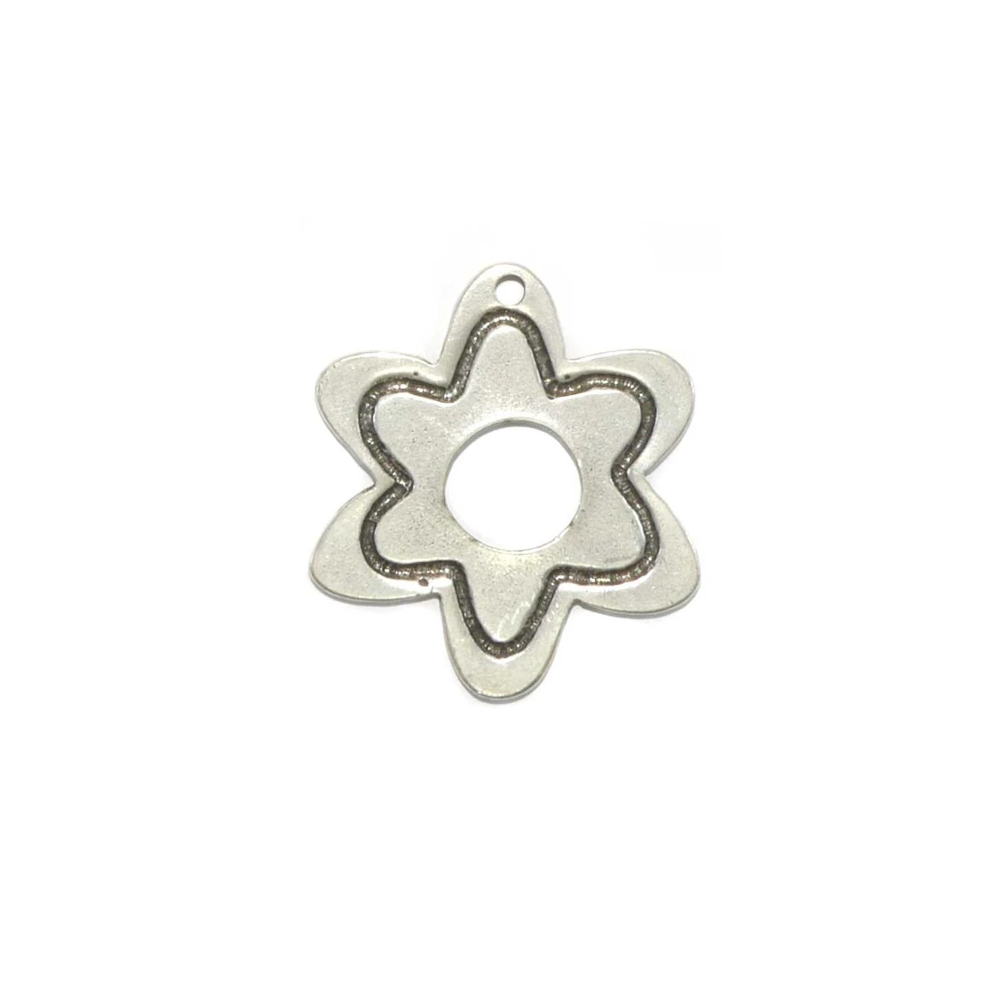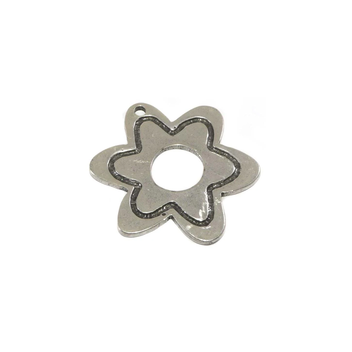 Adorno o aplique metalizado con forma de flor de 4,5cm de diámetro en color plateado y con perforación para posibilidad de colgarlo.