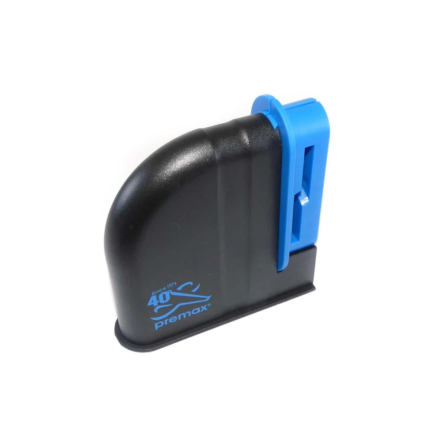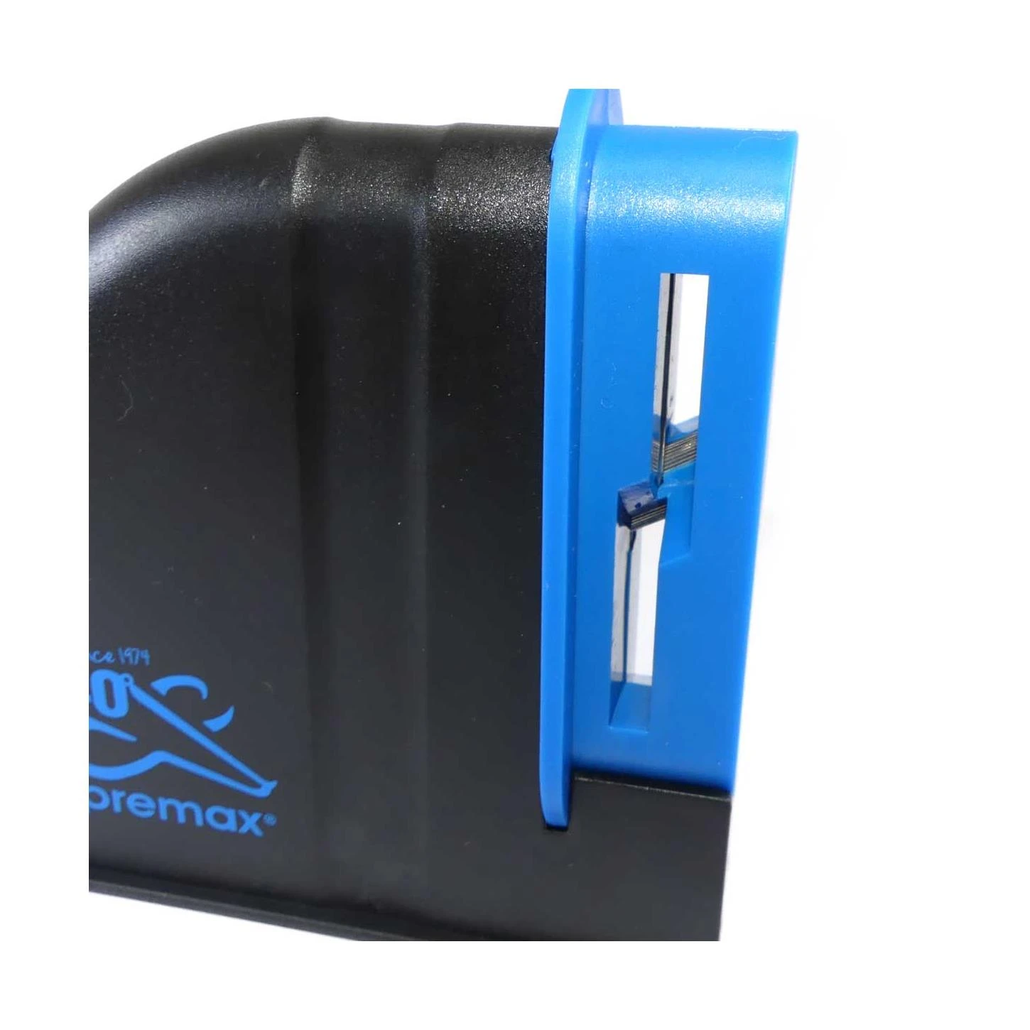 Afilador para tijeras portátil de la marca Premax. Con mango plástico en negro y azul.