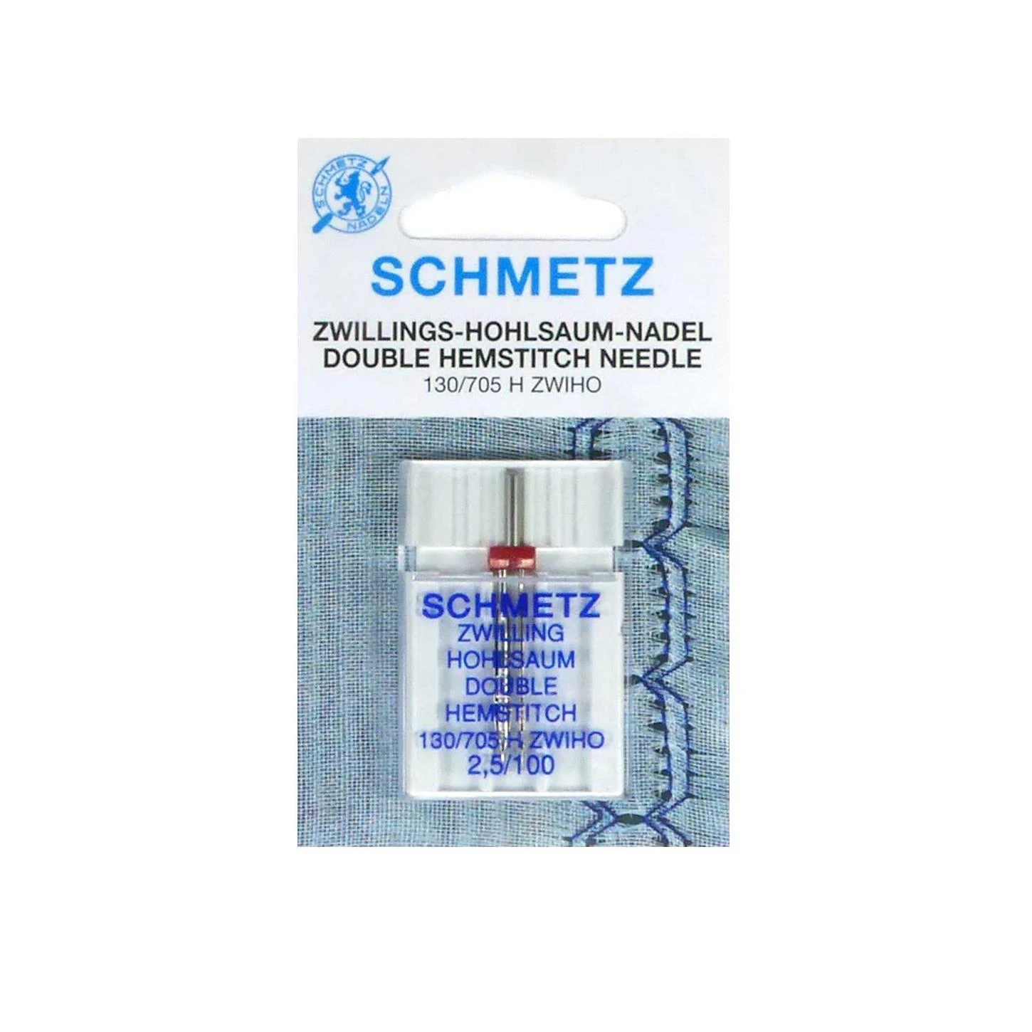 Aguja gemela para máquina de coser con talón plano, especial para realizar vainicas o calados. Combinación de aguja standar y aguja de calados. La separación entre agujas es de 2,5mm.