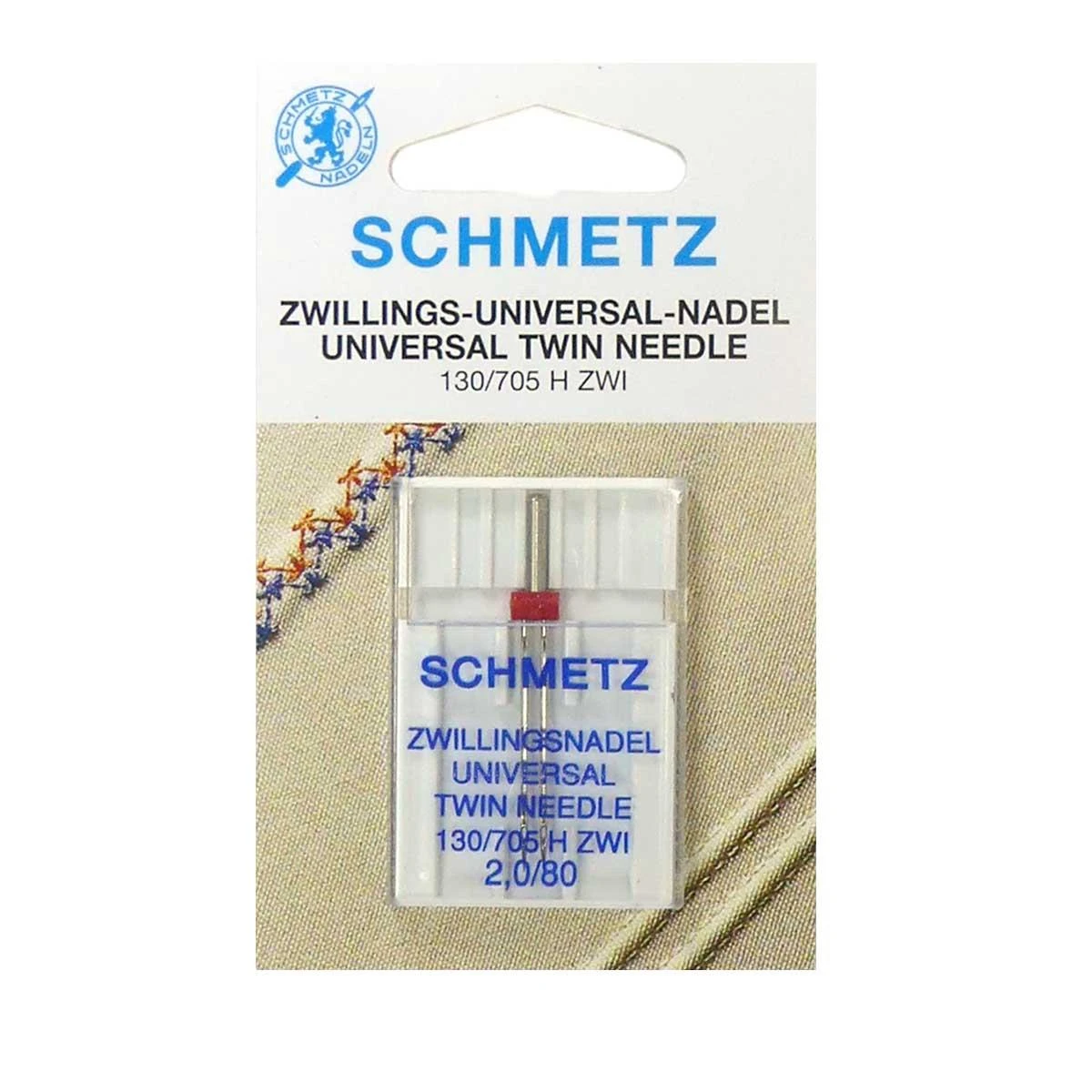 Aguja gemela universal para máquina de coser con talón plano del número 80. La separación entre agujas es de 2mm. Este tamaño de aguja es ideal para tejidos finos/medios.