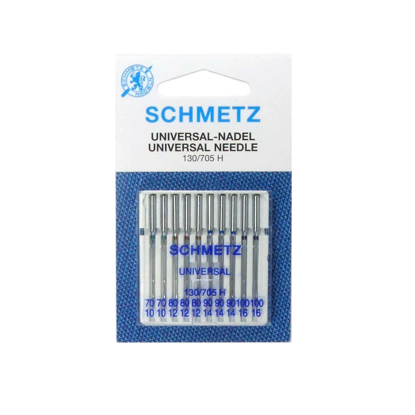 Set de 10 agujas para máquina de coser Schmetz con talón plano universal y punta ligeramente redondeada para numerosos tejidos. Disponibles tamaños del 70 al 100.