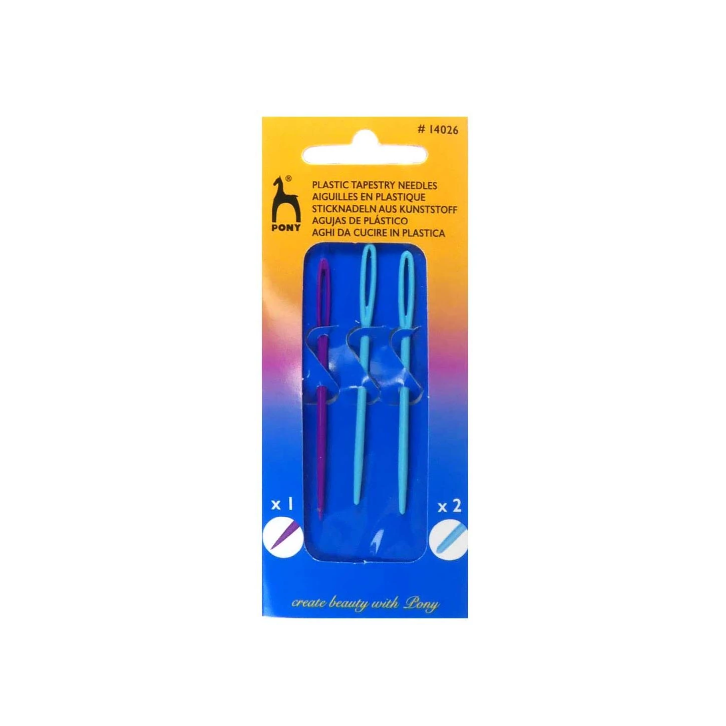 Paquete de 3 agujas en material plástico de alta calidad especiales para coser lana, dos unidades sin punta y una con punta.