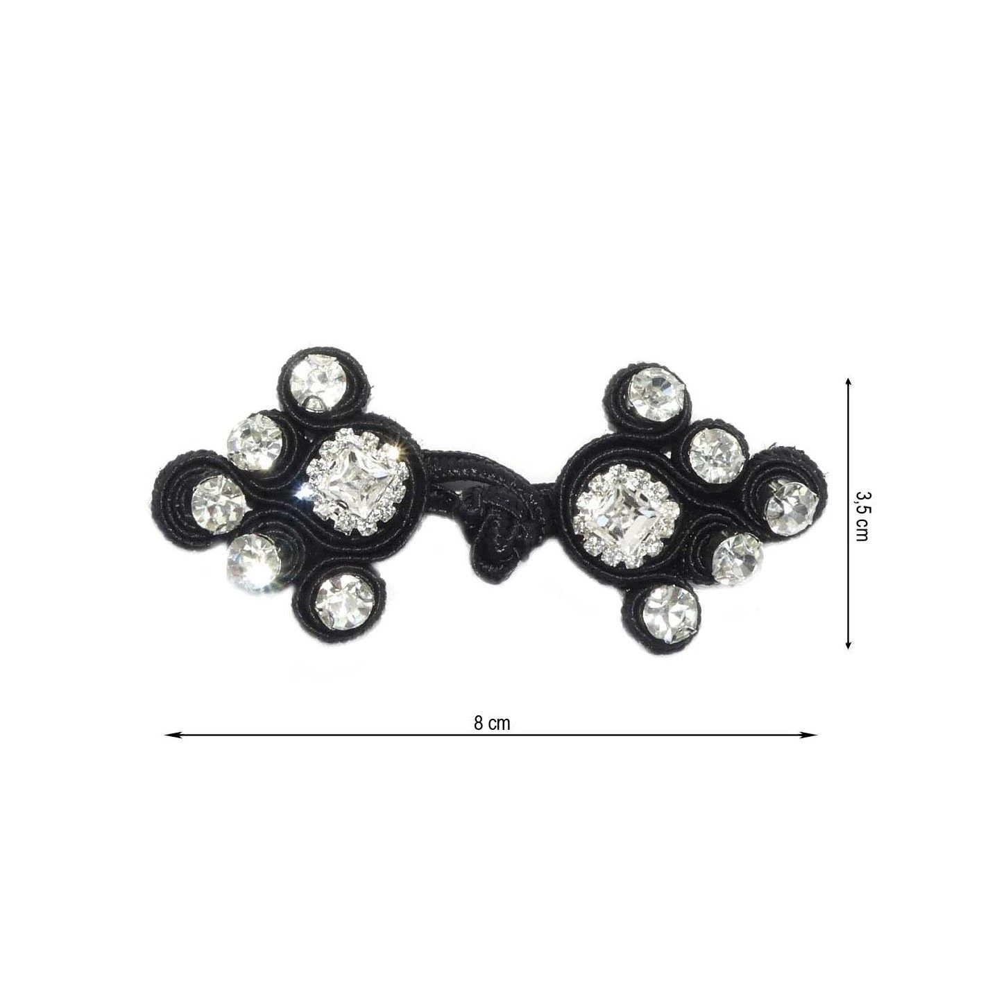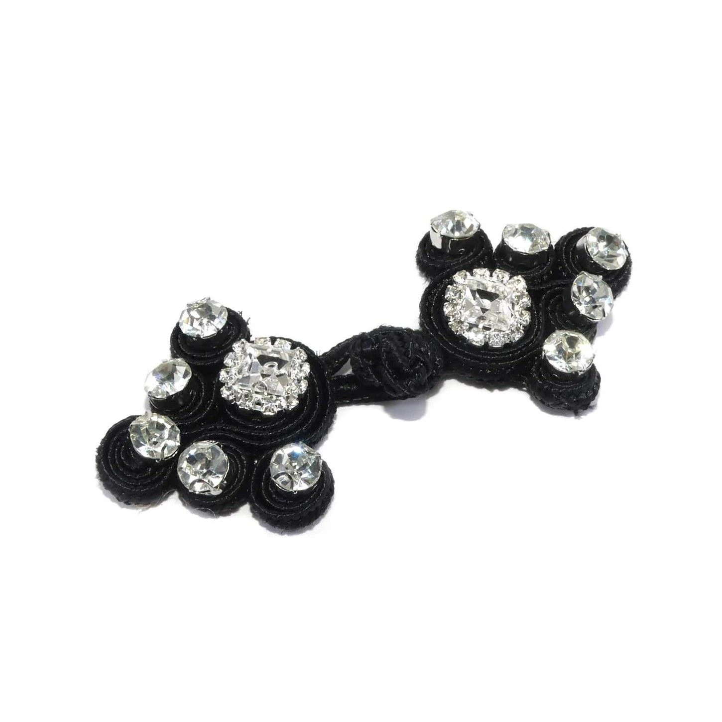 Esta pasamanería o broche de alamar en color negro con strass le dará un estilo envidiable a tus prendas. Conseguirás pasar de una prenda simple a una prenda con estilo, únicamente usando un broche como este.