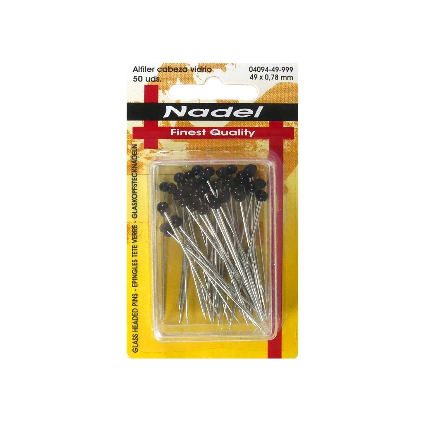 Paquete de 50 alfileres con la cabeza de cristal en color negro y 49mm de longitud. Con 0,78mm de grosor cada uno.