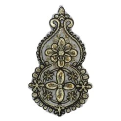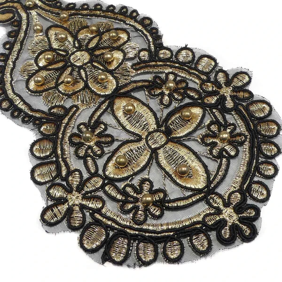 Aplicación bordada con diseño floral, en negro y oro, para coser y con perlas incorporados en el diseño. De 11cm de ancho y 19cm de alto.