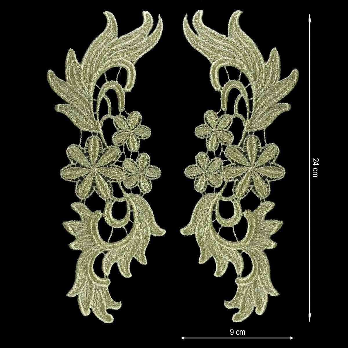 Aplicación bordada en dorado para coser, con motivos florales. Cada parte tiene una longitud de 24cm y un ancho de 9cm.