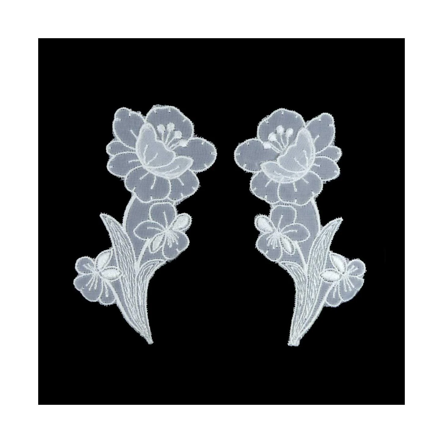 Aplicación bordada para coser, en blanco con motivo floral. Cada parte tiene un ancho de 5cm y un alto de 11cm.