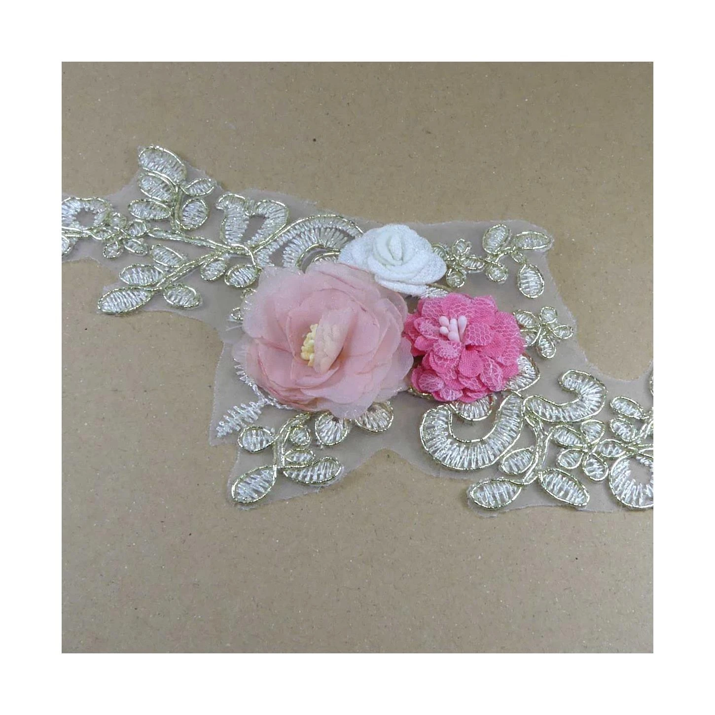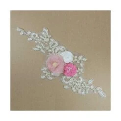 Aplicación bordada en dorado con composición de flores variadas en tonos rosa incorporadas en el diseño. Con una longitud de 24cm y un ancho de 9cm.