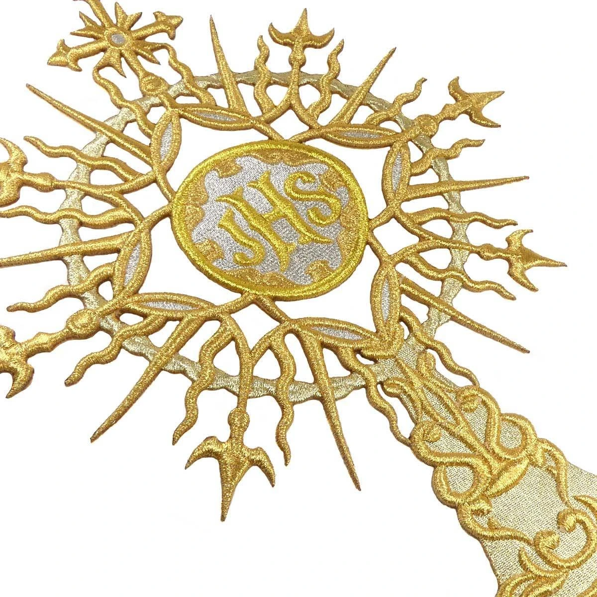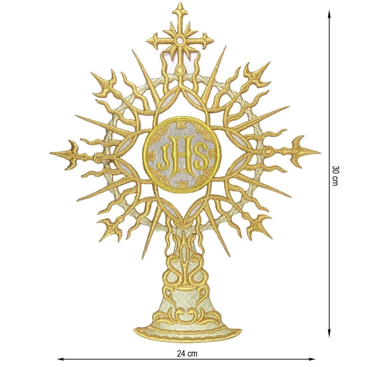 Aplicación bordada con hilo en dos tonos dorados para coser con forma de custodia e insignias JHS, de 24cm de ancho y 30cm de alto. De un grosor de 3mm.