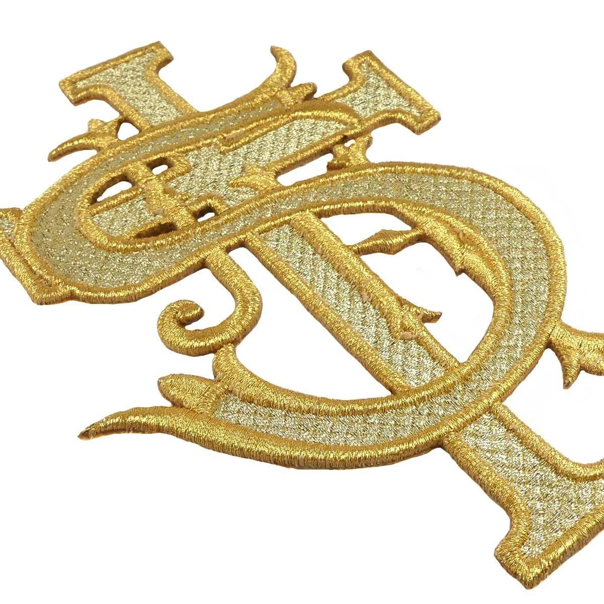 Aplicación bordada con dos tonos de hilo dorado, para coser con forma de insignias JHS con cruz, de 11cm de ancho y 16cm de alto. De un grosor de 3mm.
