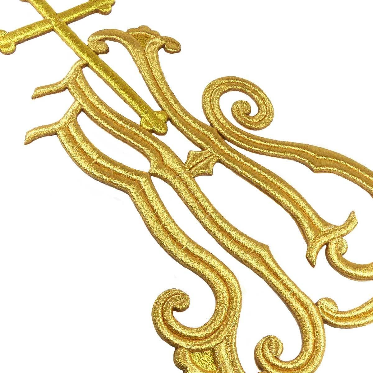 Aplicación religiosa bordada con hilo dorado para coser con forma de insignias JHS con cruz, de 15cm de ancho y 27cm de alto. De un grosor de 3mm.