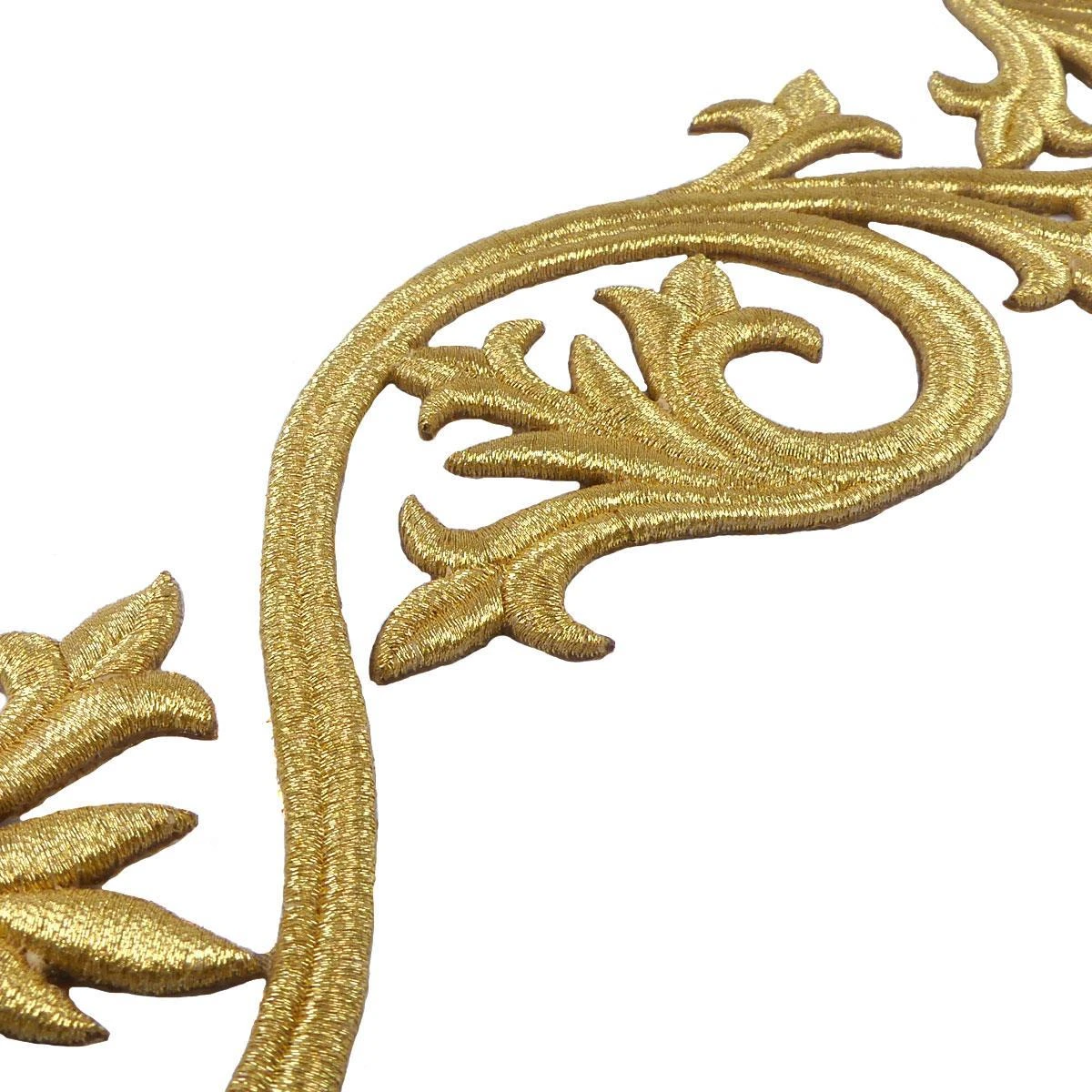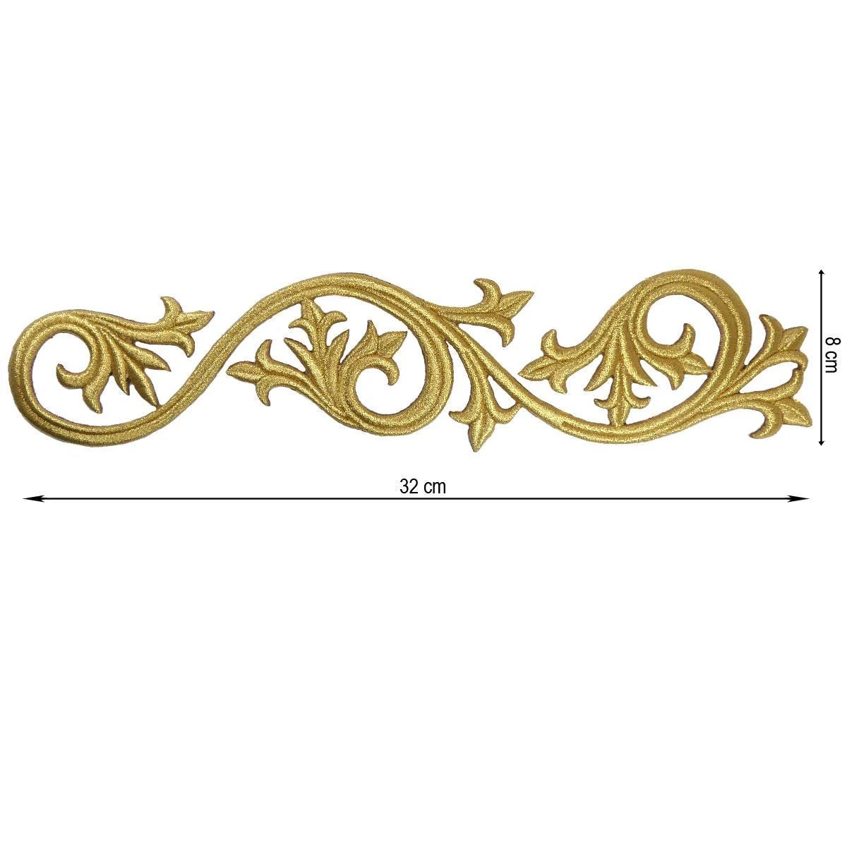 Aplicación para coser con mucho cuerpo (3mm de grosor), bordada con un tono de hilo dorado y forma de orla grande derecha, de dimensiones: 32cm de ancho y 8cm de alto.