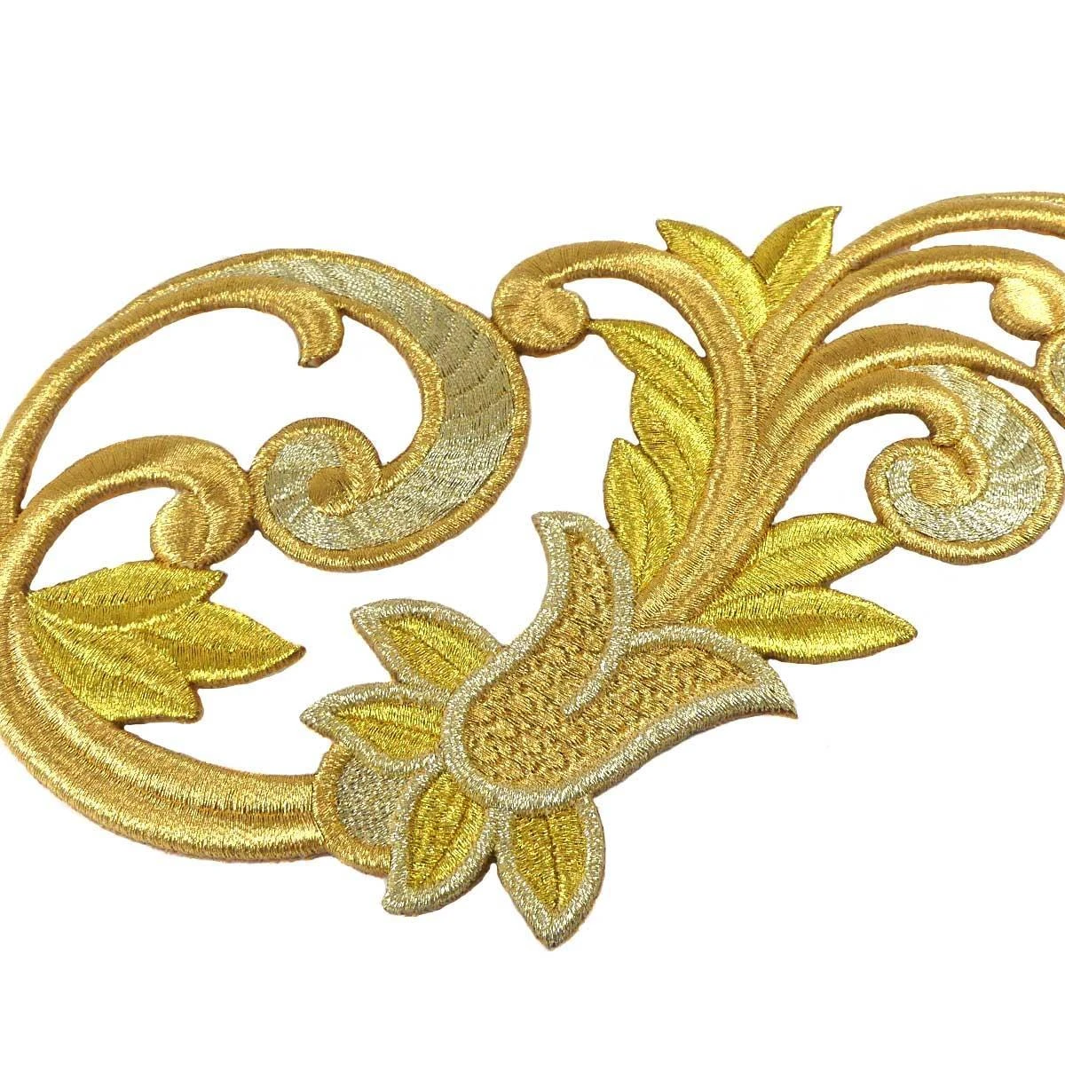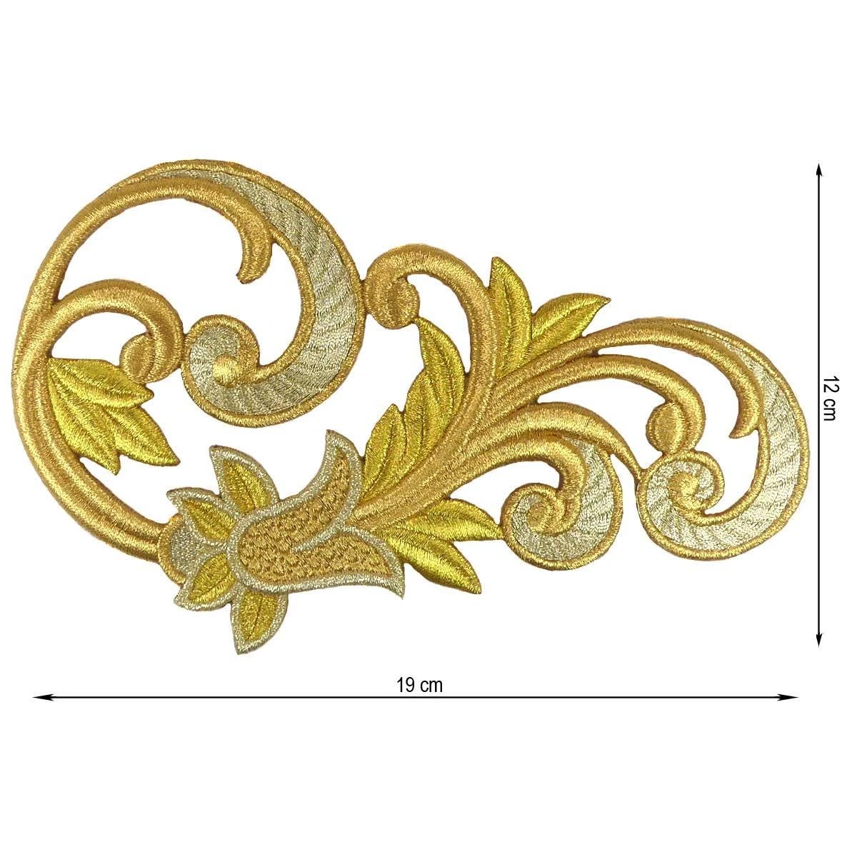 Aplicación para coser con mucho cuerpo (3mm de grosor), bordada con dos tonos de hilo dorado y forma de orla con tulipán derecha, de dimensiones: 19cm de ancho y 12cm de alto.