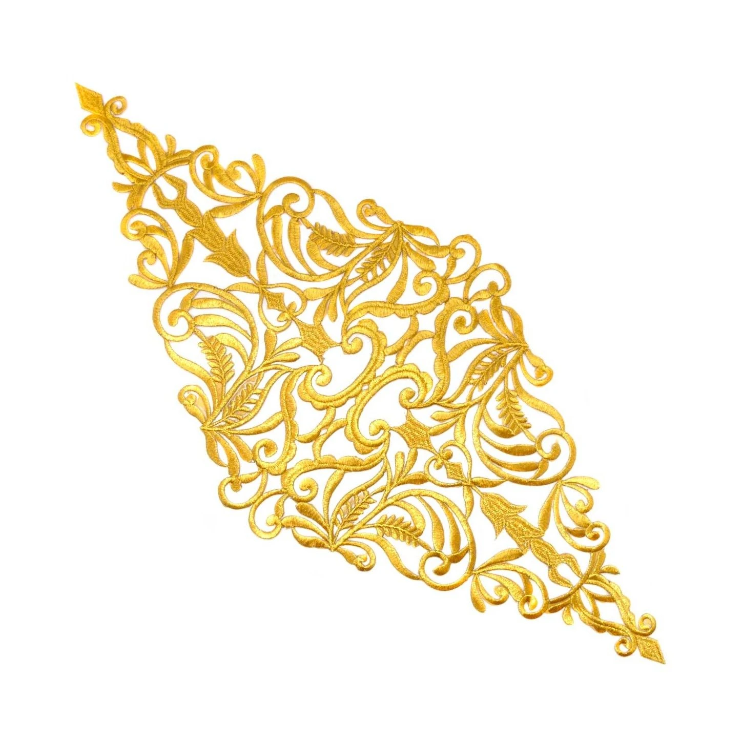 Aplicación termoadhesiva grande, bordada con hilo metalizado dorado con diseño de rombo con elementos ornamentales. De 60cm de alto y 26cm de ancho.