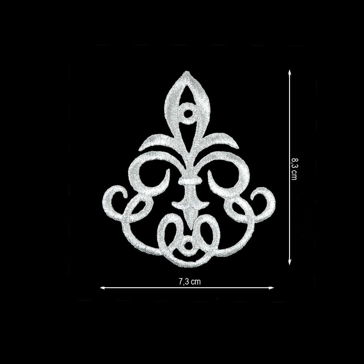 Aplicación termoadhesiva, bordada con hilo plateado o dorado, de dimensiones: 7,5cm de ancho y 8,3cm de alto. Para pegar con plancha sin necesidad de coser.