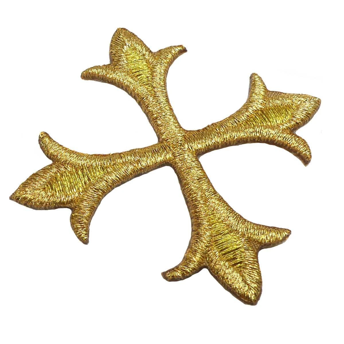 Aplicación termoadhesiva en forma de cruz, bordada con hilo dorado de dimensiones: 6cm de ancho y 6cm de alto con un grosor de 1mm. Para pegar con plancha sin necesidad de coser.