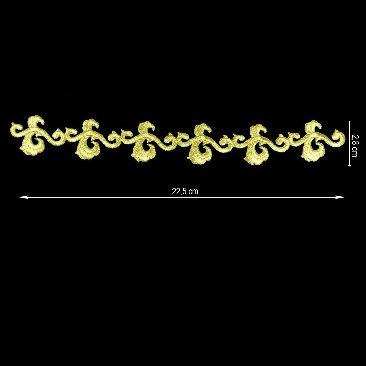 Aplicación termoadhesiva en cenefa, bordada con hilo dorado de dimensiones: 22,5cm de ancho y 2,8cm de alto. Para pegar con plancha sin necesidad de coser.