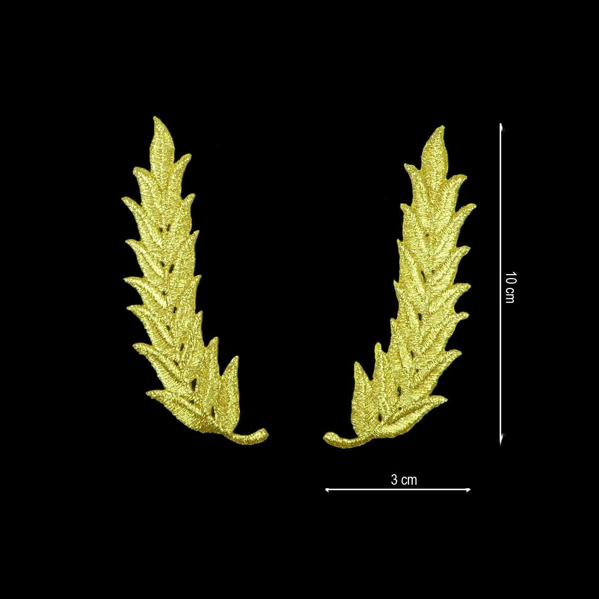 Pareja de aplicaciones termoadhesivas, bordadas con hilo plateado o dorado, de dimensiones: 3cm de ancho y 10cm de alto. Para pegar con plancha sin necesidad de coser.
