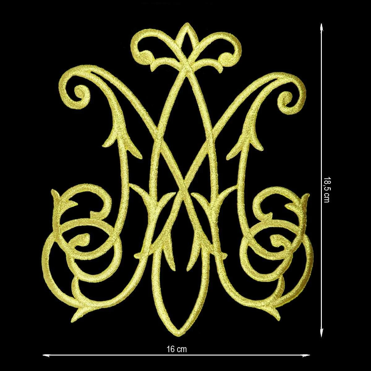 Aplicación termoadhesiva, bordada con hilo dorado o plateado y forma de insignias religiosas, de dimensiones: 16cm de ancho y 18,5cm de alto. Para pegar con plancha sin necesidad de coser.