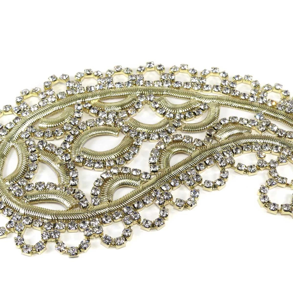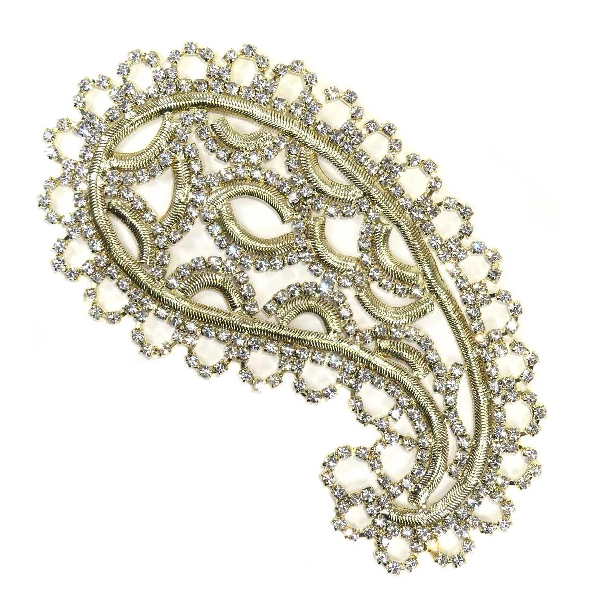 Aplicación de strass blanco engarzado sobre base metálica dorada conformando un precioso diseño de cachemir. Tiene una longitud de 13,5cm y un ancho total de 8cm.