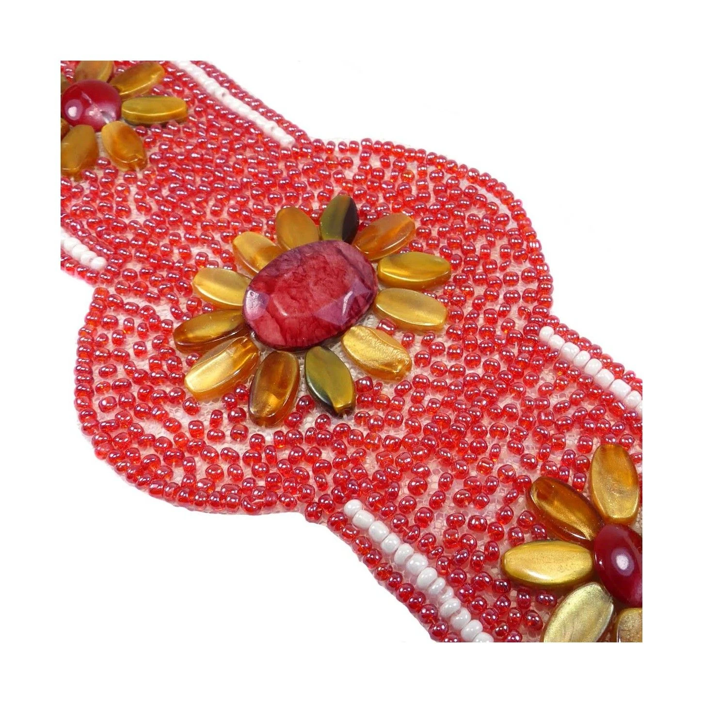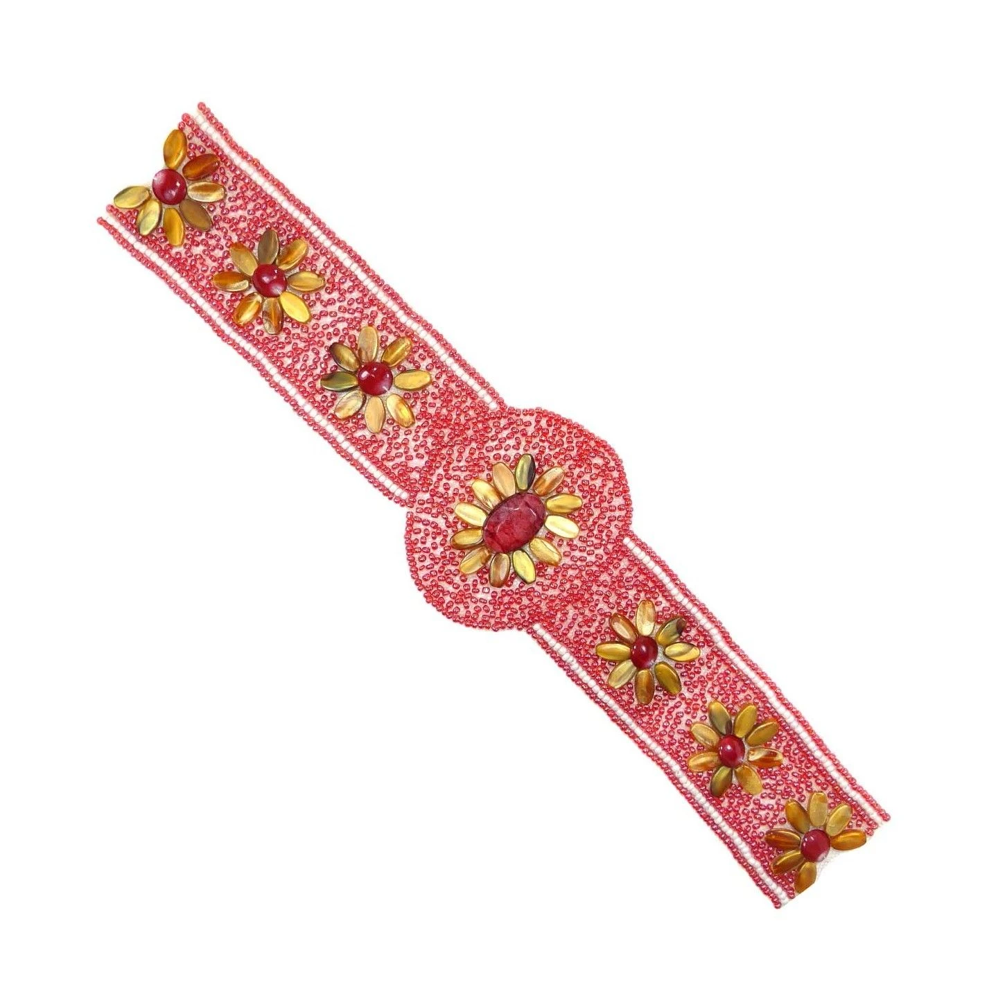 Aplicación étnica con 35cm de largo y 8,5cm de ancho. Realizada con piezas de rocalla en rojo/coral y blanco, cosidas sobre una base de tul blanco y piedras conformando pequeñas flores.