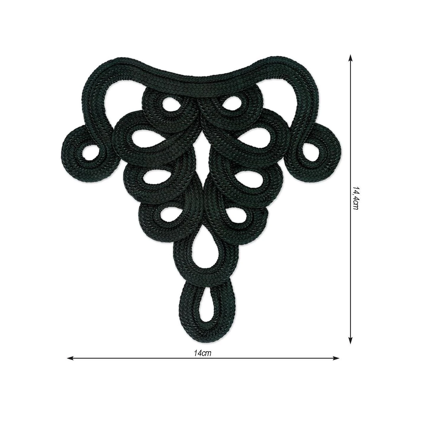 Aplicación negra para coser realizada con pasamanería de rayón y forma triangular. De 14cm de ancho y 14,4cm de alto.