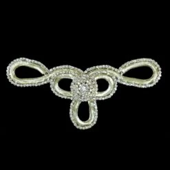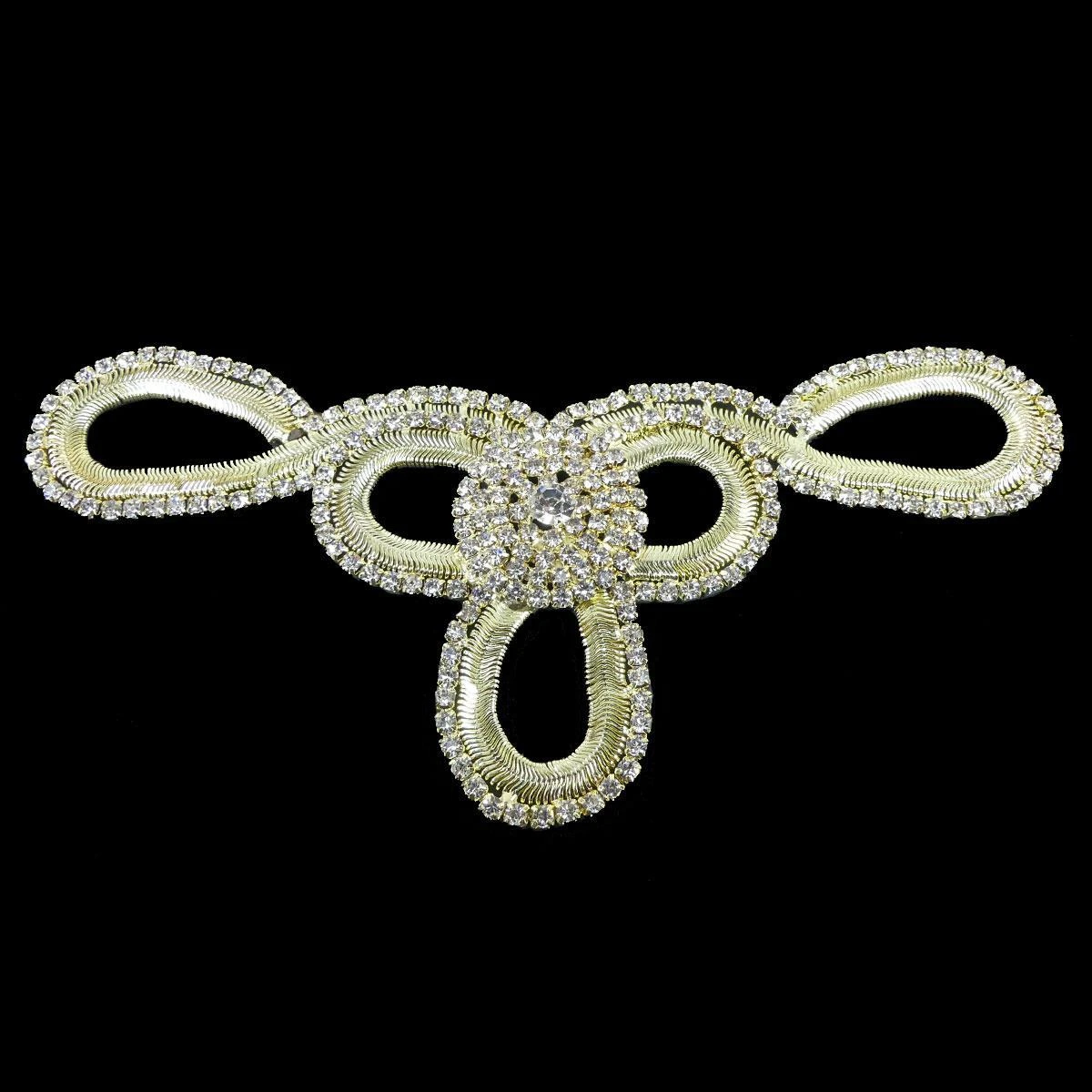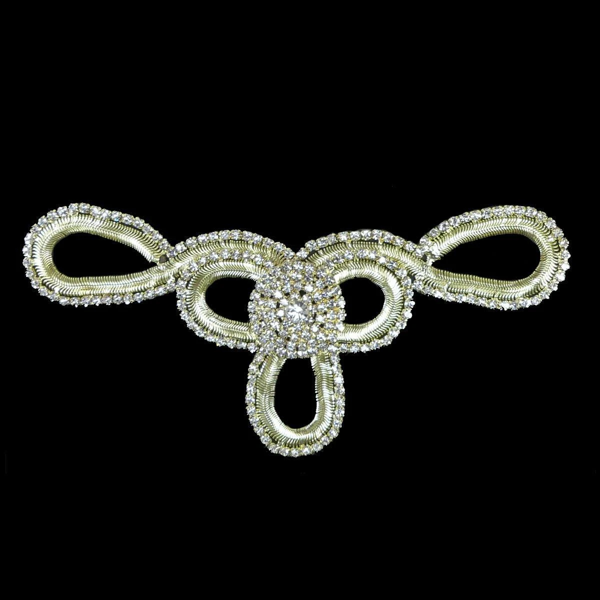 Aplicación de strass blanco y cristal de distintos tamaños, engarzados sobre base metálica dorada conformando un precioso diseño geométrico. Tiene una longitud de 16cm y un ancho total de 8cm.