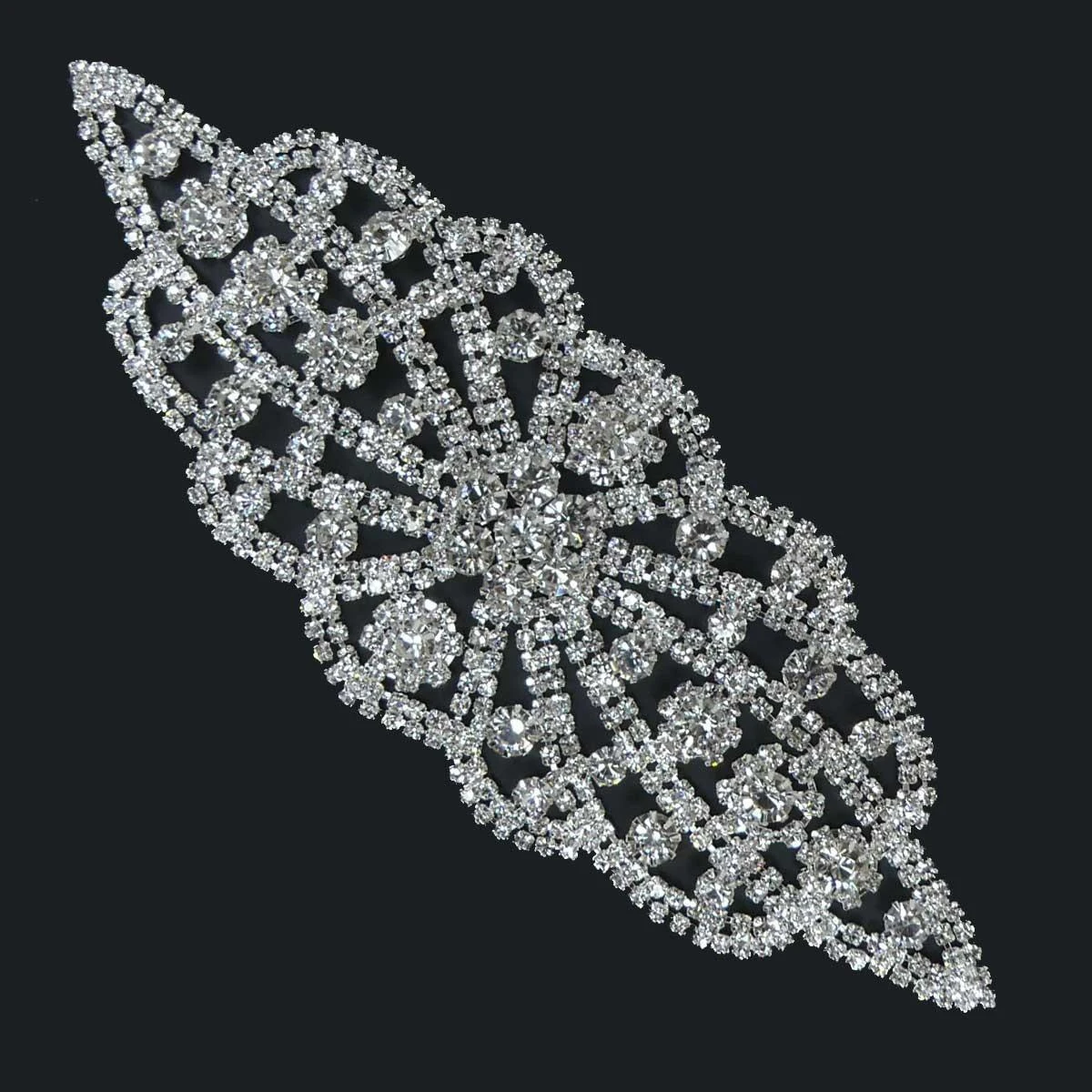Aplicación de strass blanco de diferentes diámetros engarzado sobre base metálica en plata y con diseño floral. De 19cm de largo y 7,5cm de alto. Para coser.