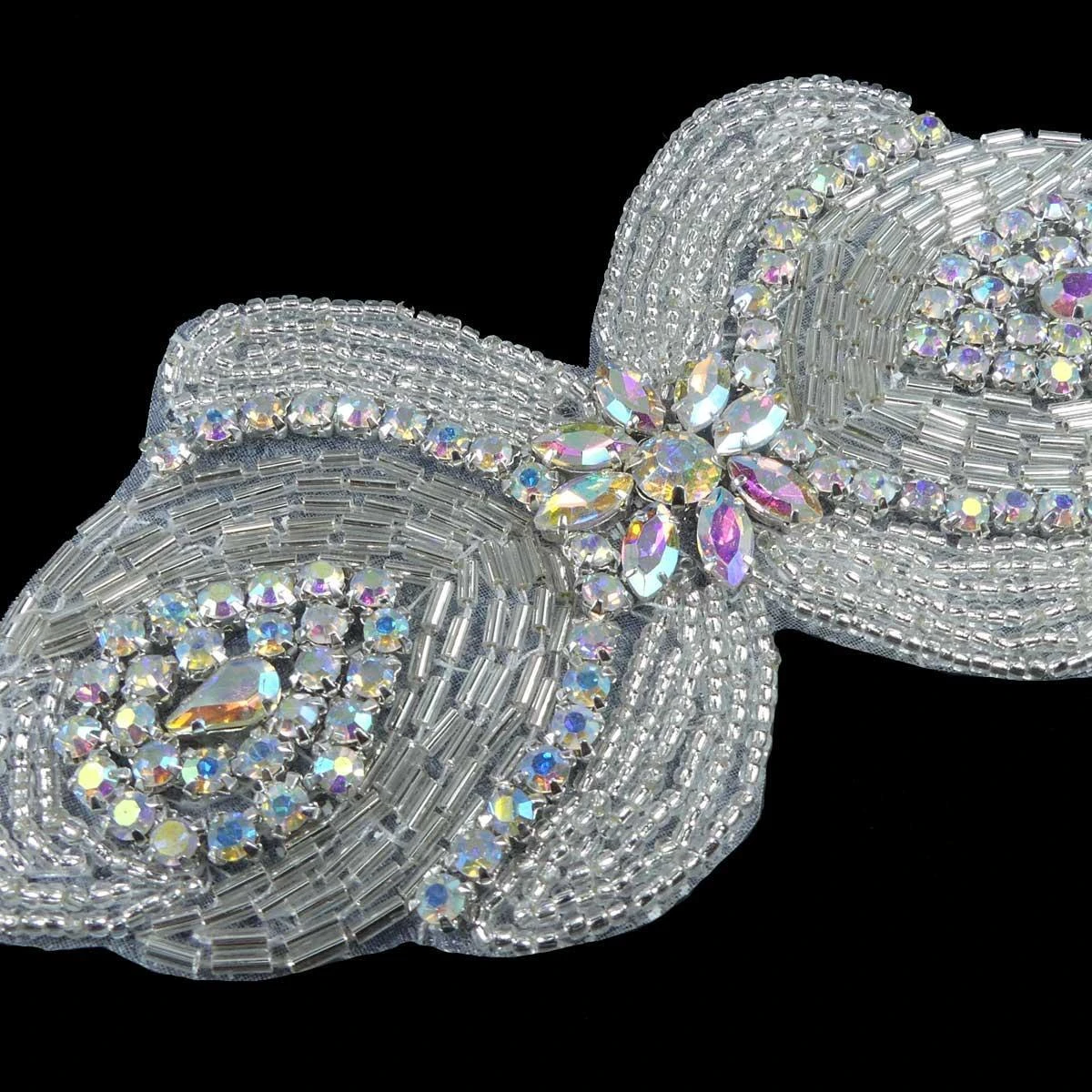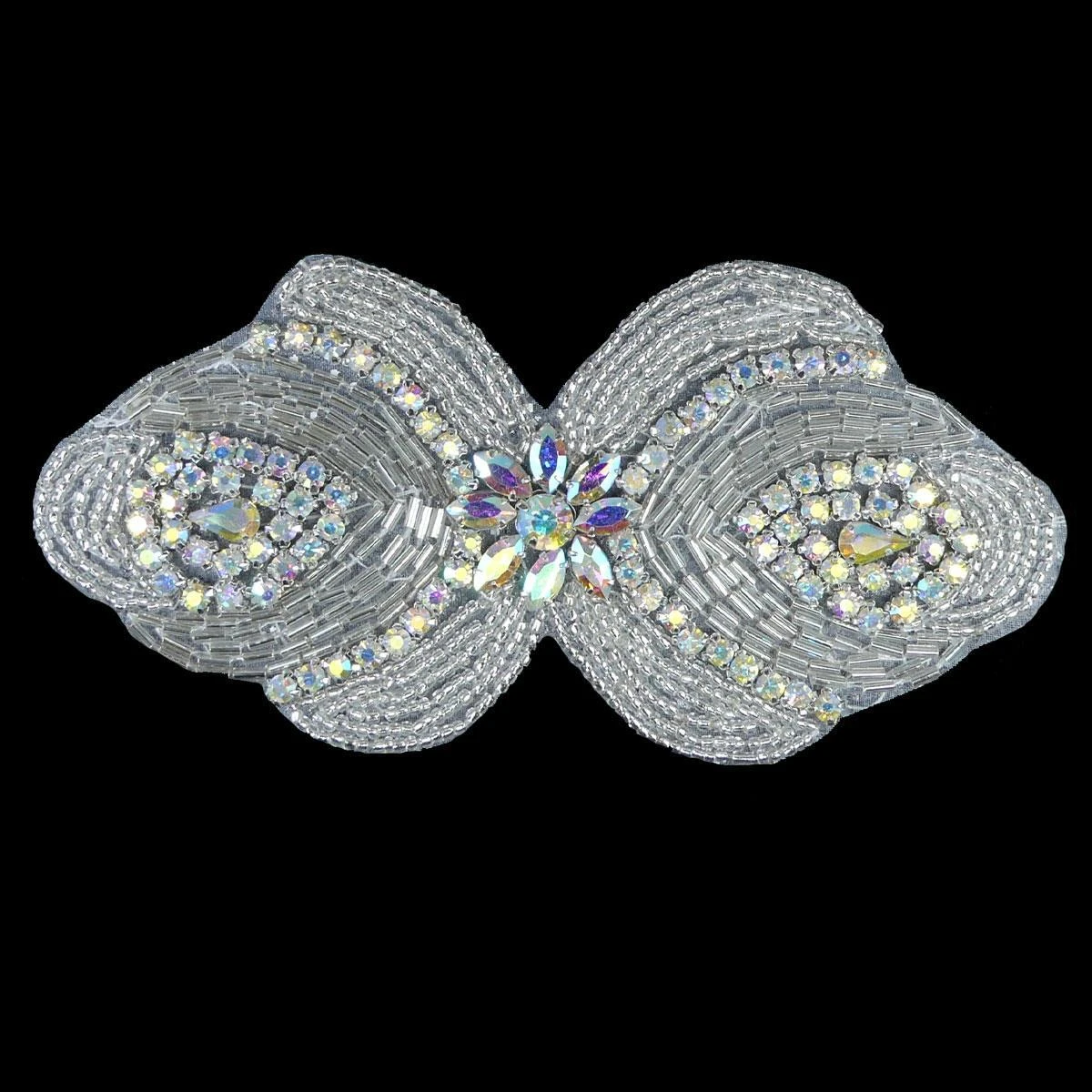 Aplicación de strass blanco y rocalla para pegar con plancha con un precioso diseño sofisticado. De 14,5cm de longitud y 7,5cm de alto y color blanco-plateado.