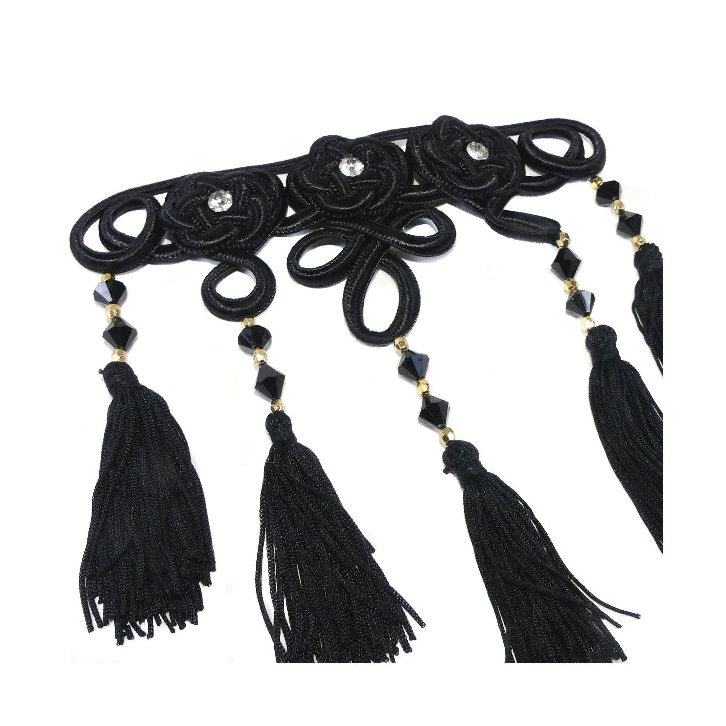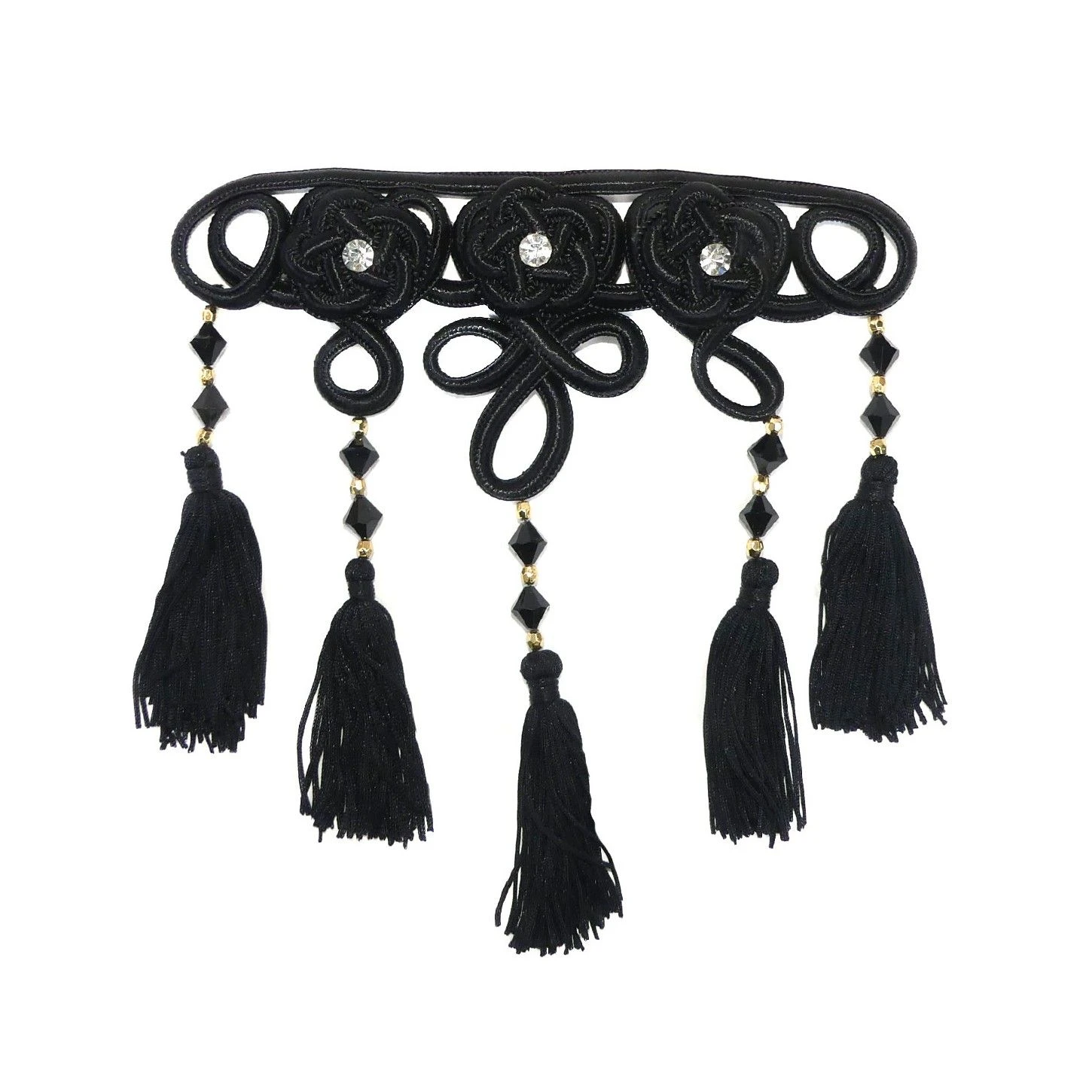 Aplicación de pasamanería negro con cinco borlas decoradas con abalorios y strass. De 16cm de ancho y 16cm de largo.
