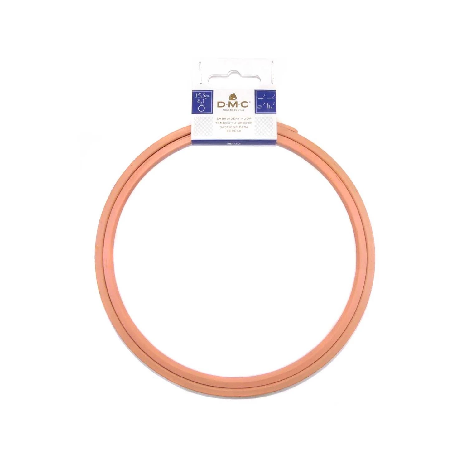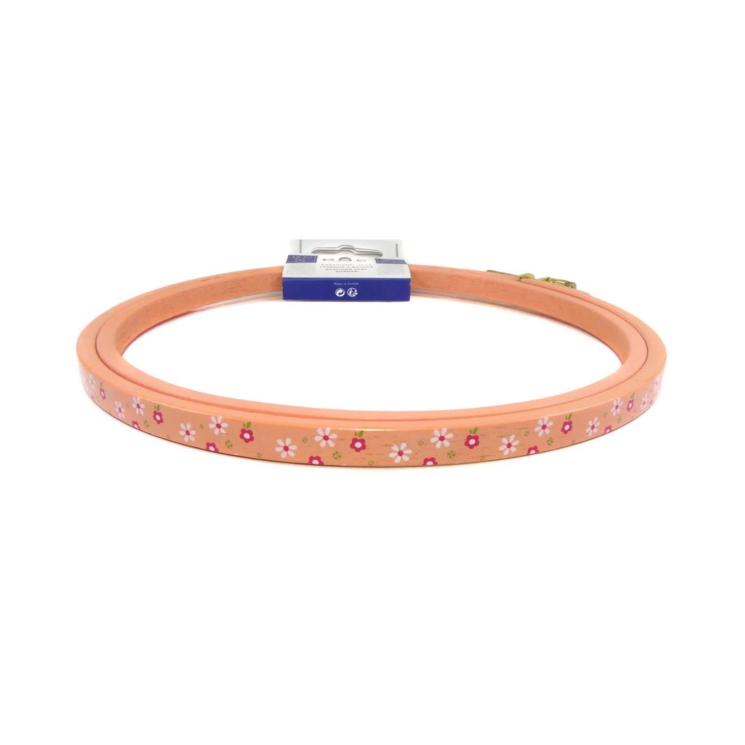 Aro para bordar con doble circunferencia de madera decorada con flores y con tornillo de presión. De 15,5cm de diámetro de la marca DMC.
