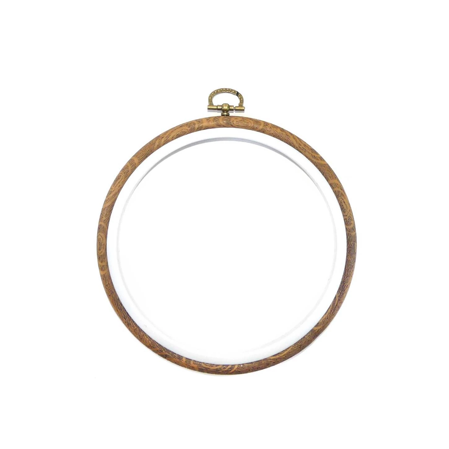 Aro para bordar con doble aro, de plástico de imimadera y con semi anilla decorativa para poder colgarlo. Disponible en tamaño interior: 12cm (XS), 14,5cm (S), 18,7cm (M) y 25cm (L). Seleccionar el tamaño deseado a continuación.
