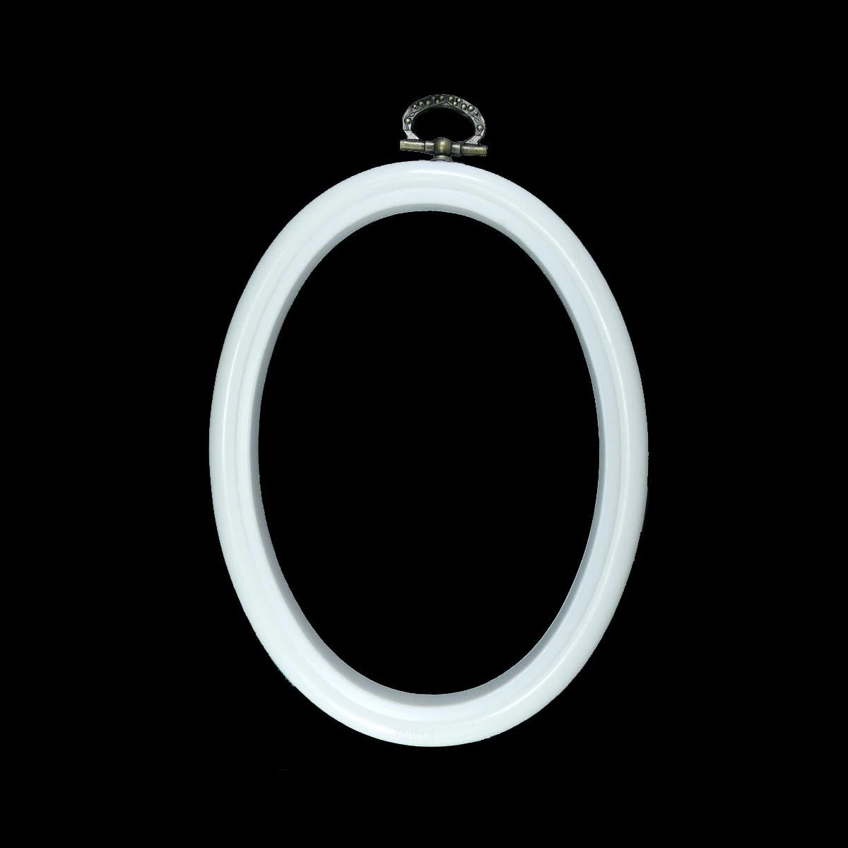Aro para bordar con doble óvalo plástico en blanco y con semi anilla decorativa para poder colgarlo. Disponible en tamaño interior: 9×12,8cm (S) y 12,2×16,7cm (L). Seleccionar el tamaño deseado a continuación.