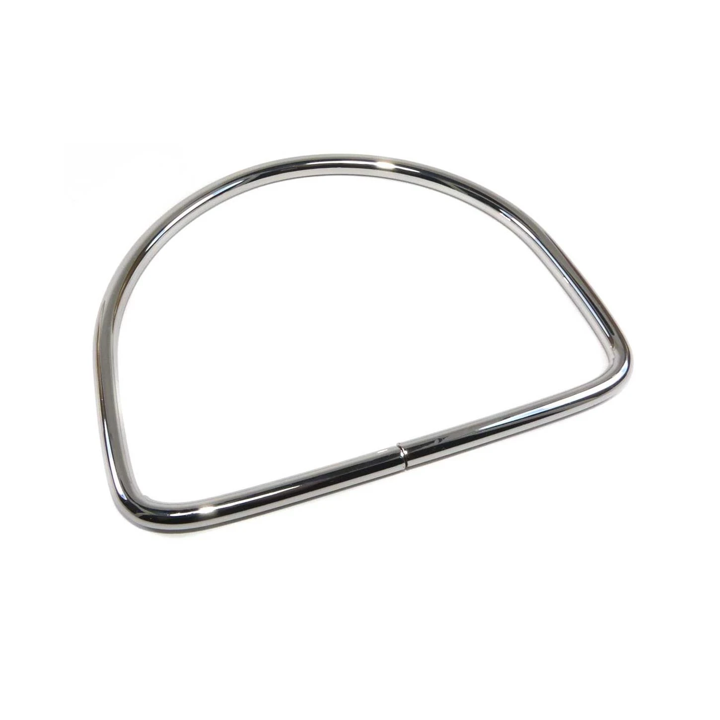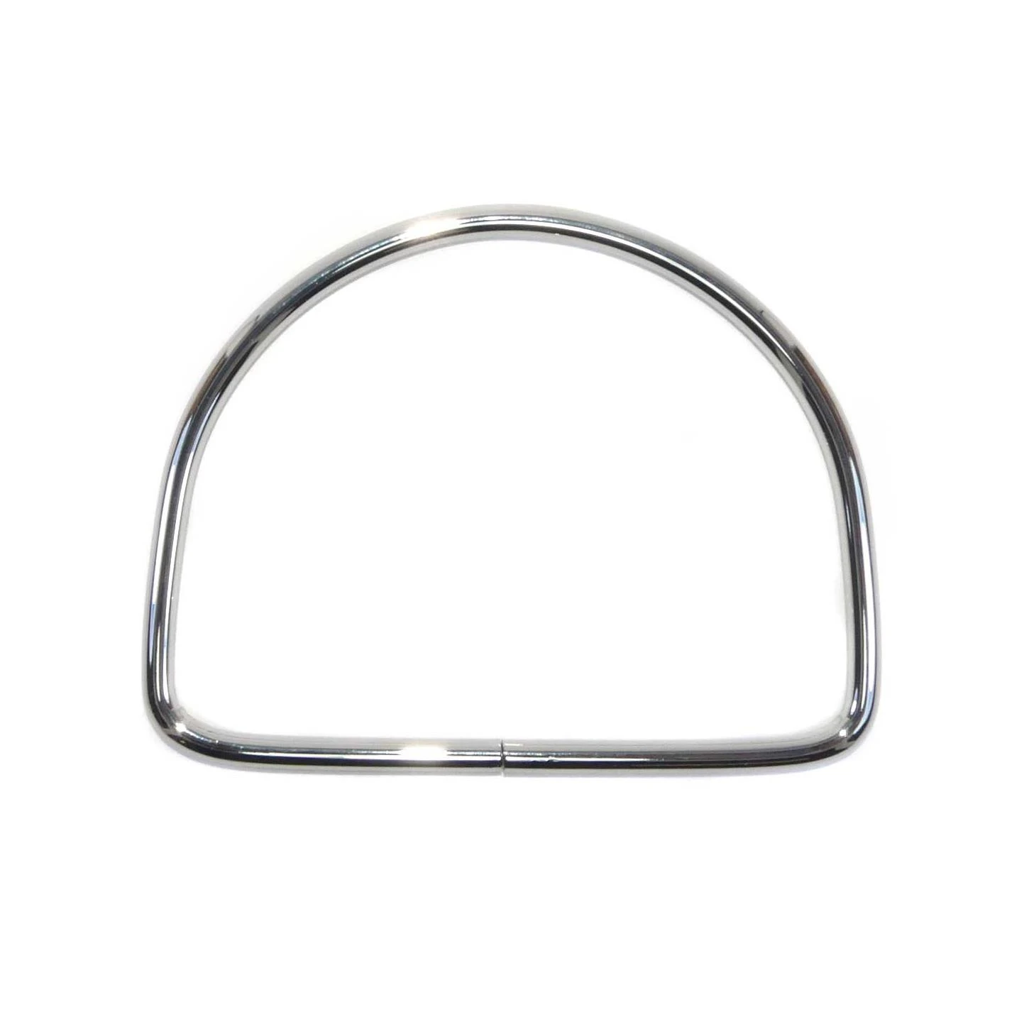 Un asa para bolso realizada en metal de color plata y forma de media circunferencia. De 13cm de longitud y 10,5cm de altura.