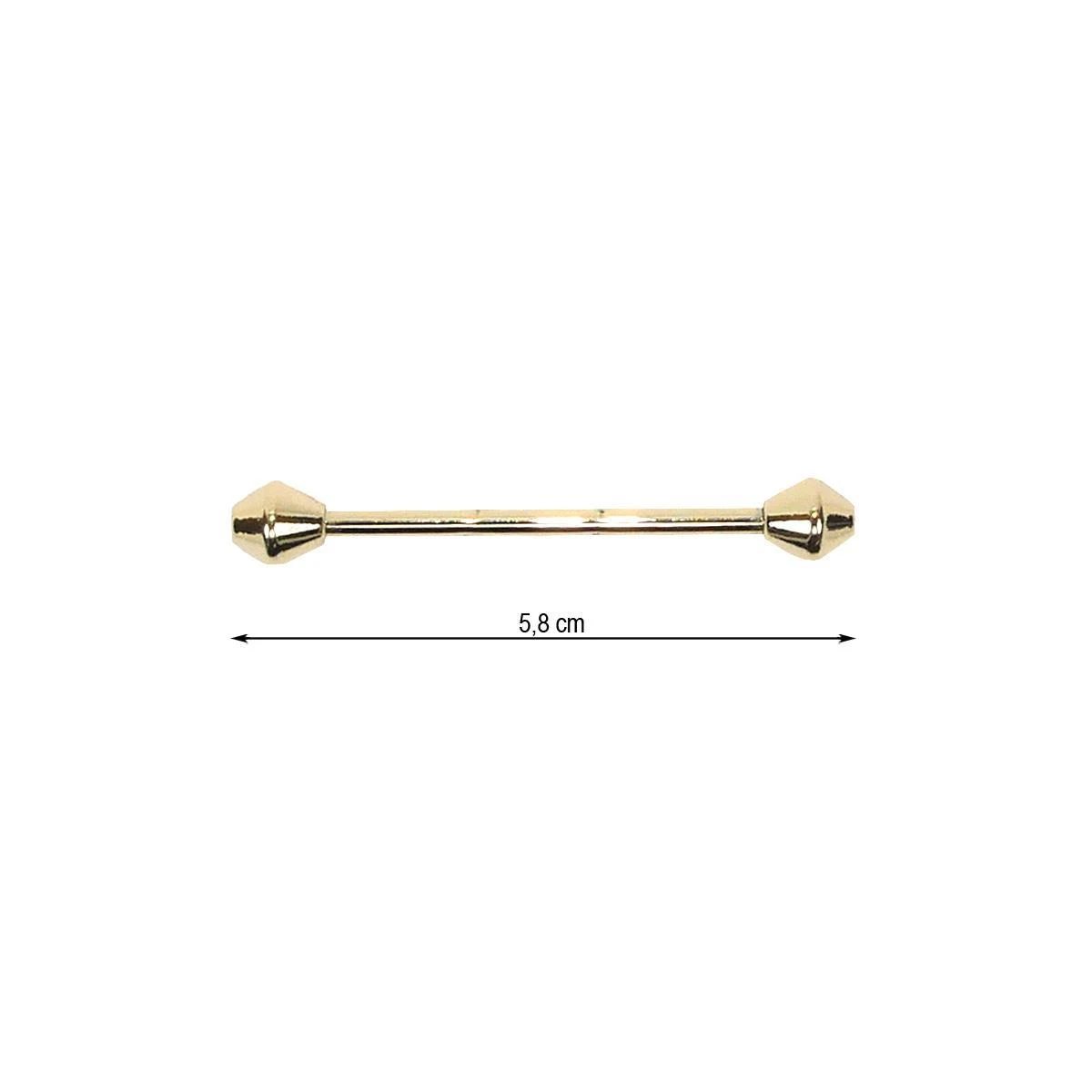 Barra de cierre para camisa, metálica dorada con dos piezas conoidales en cada extremo. Con una longitud total de 5,8cm, con 8mm de diámetro de cada pieza.