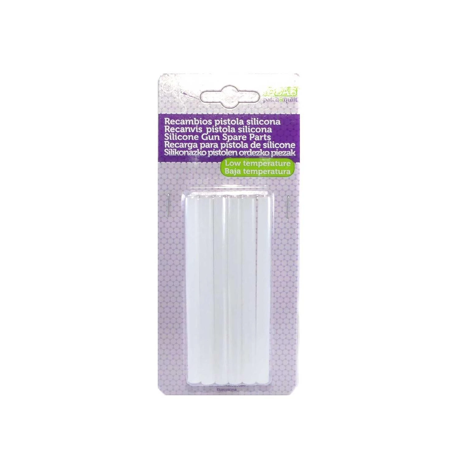 Doce barras de siliconado o cola transparente para pistola de baja temperatura, con 7mm de diámetro. Permite pegar materiales como metales, cartón, tejido, foam, corcho o papel.