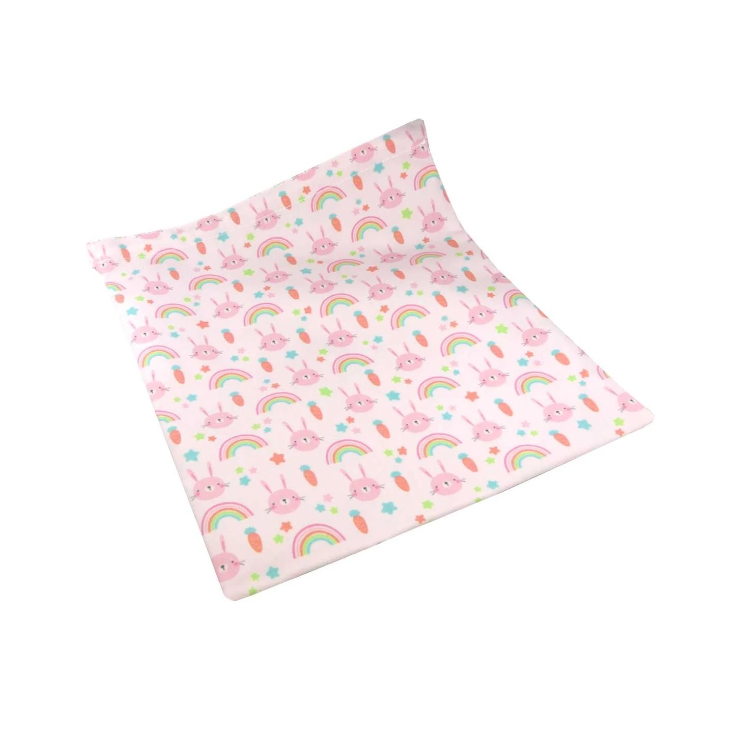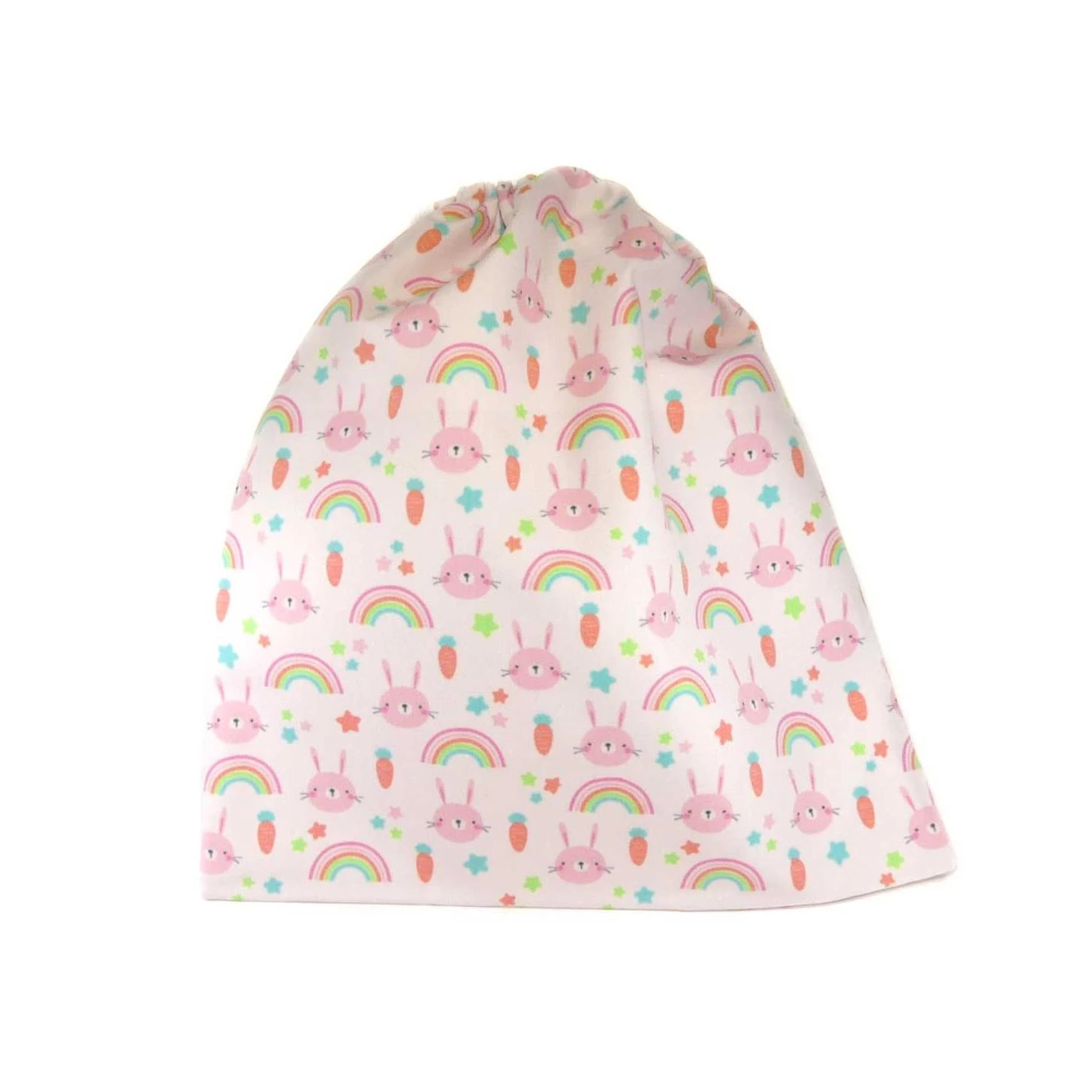 Bolsa de merienda para niños/as con cierre de cordón y estampado de conejos, zanahorias y arcoiris. Dimensiones: 25cm de ancho y 28cm de alto aproximadamente.