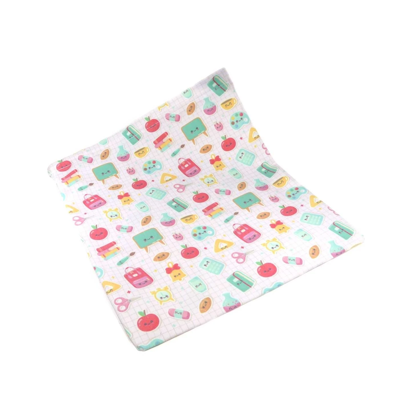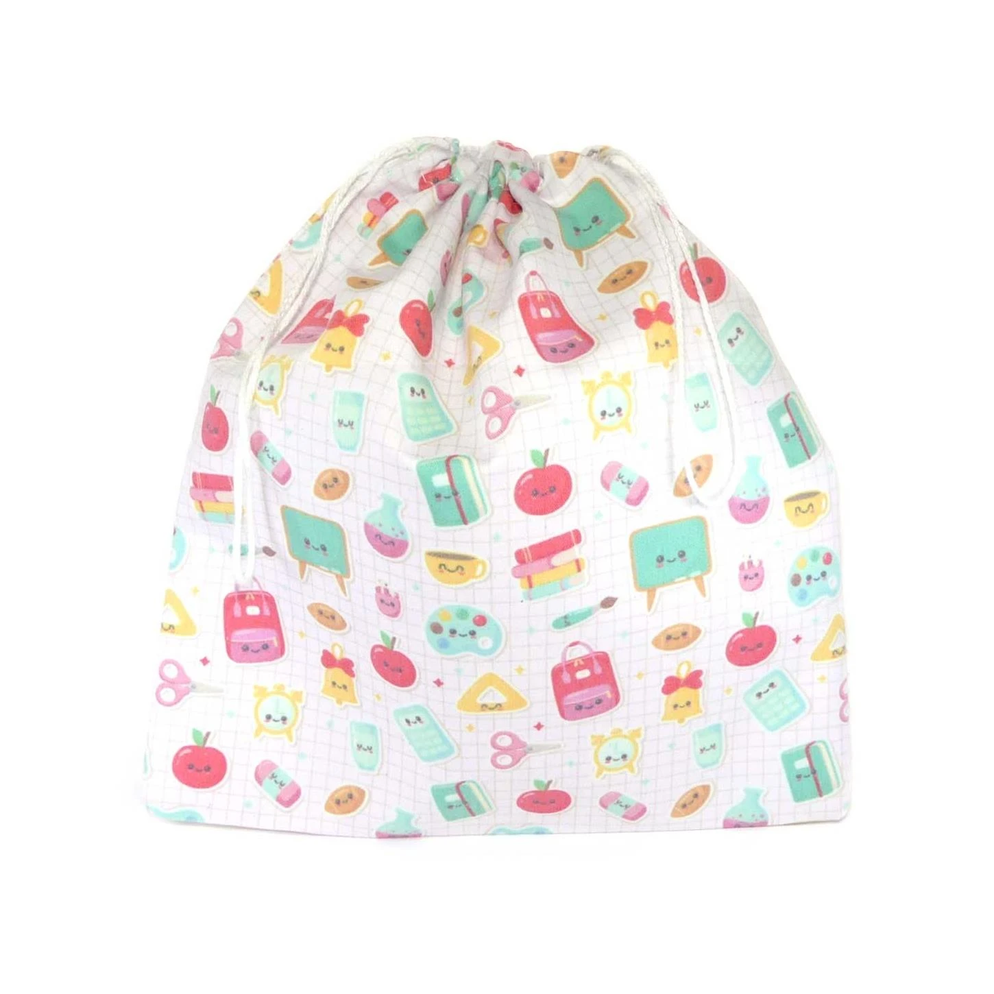 Bolsa de merienda para niños/as con cierre de cordón y estampado original de elementos del cole sobre fondo blanco. Dimensiones: 25cm de ancho y 28cm de alto aproximadamente.