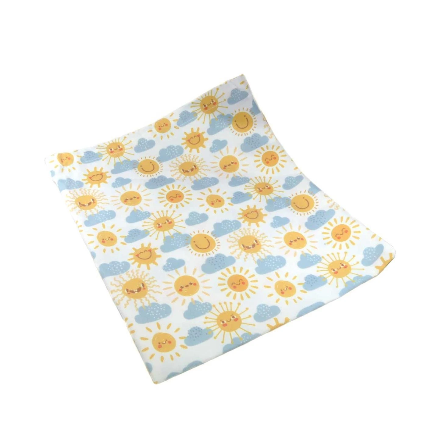 Bolsa de merienda para niños/as con cierre de cordón y dibujo de nubes y soles sobre fondo blanco. Dimensiones: 25cm de ancho y 28cm de alto aproximadamente.