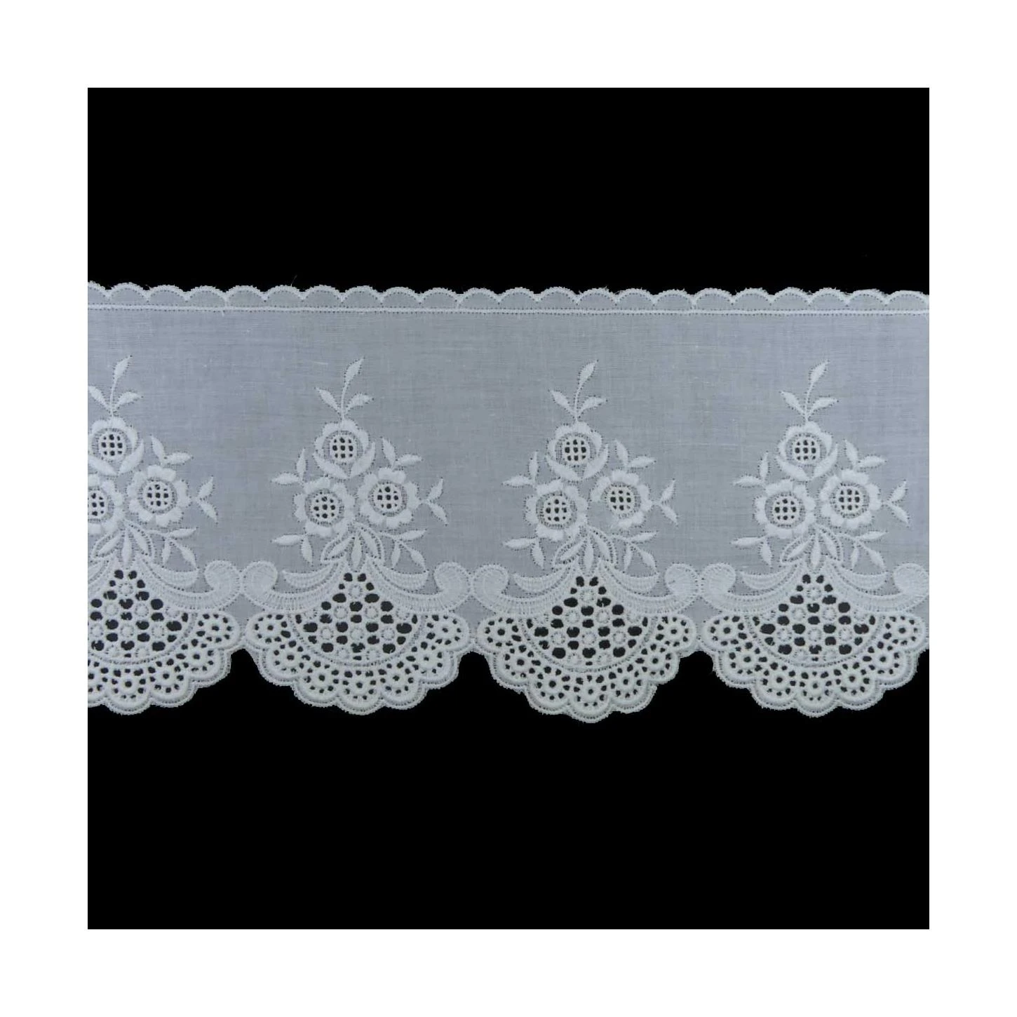 Tira bordada de batista (algodón 100%) en color blanco y de 9,5cm de ancho. Con diseño floral, con acabado en festón.