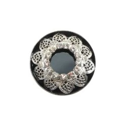 Es un botón de metal en color plata de estilo Damasco con lacado en negro y un diseño en forma de flor que incorpora strass engarzado.
