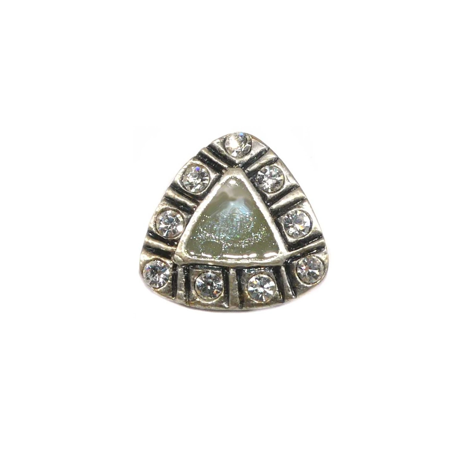 Original botón de strass y base plateada, para coser por debajo y con diseño triangular. Con 5mm aproximadamente de alto.