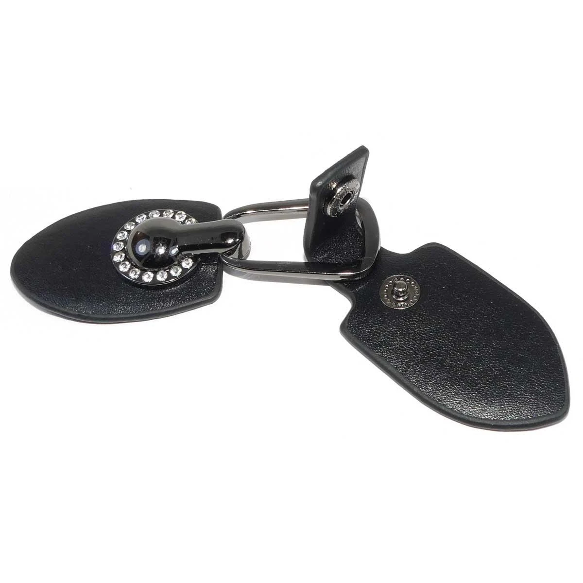 Broche de trenka o chamaco en negro y cierre con automático. Con pequeñas piezas de strass incorporadas en el diseño. La longitud del broche completo es de 14cm.