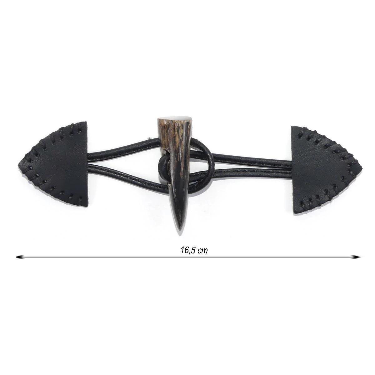 Broche de trenka o chamaco de piel con pespunte en sus bordes del mismo color y botón con forma de cuerno jaspeado en marrón oscuro. La longitud del broche completo es de 16,5cm.