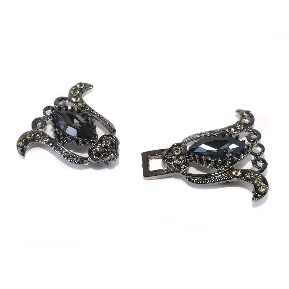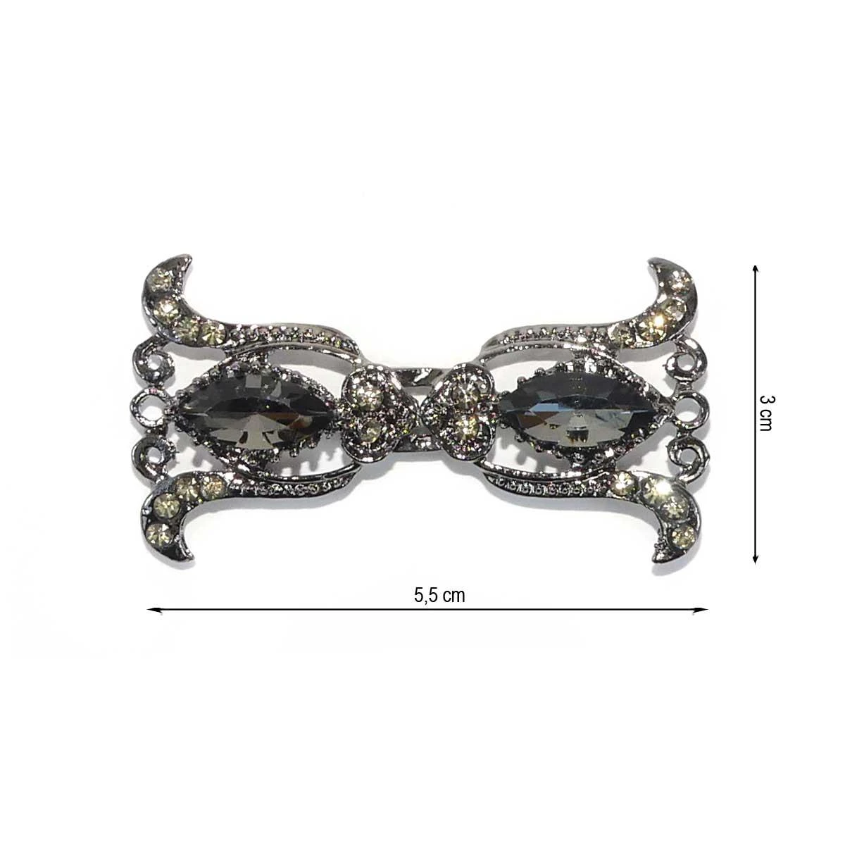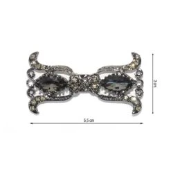 Broche o cierre de fantasía, metalizado con piezas de strass y cristal con forma de campanas en color pavonado. Tiene una longitud de 5,5cm y un ancho de 3cm.