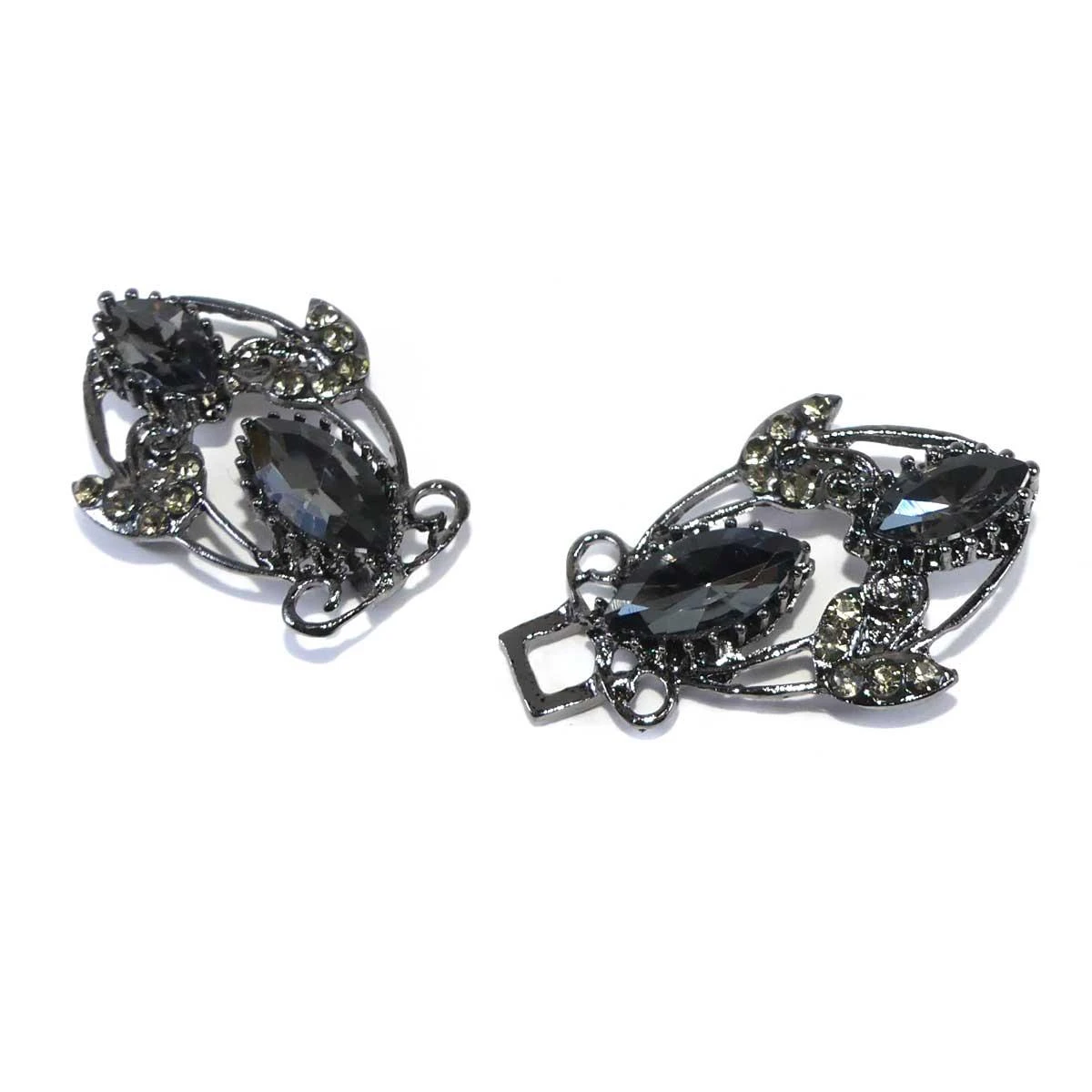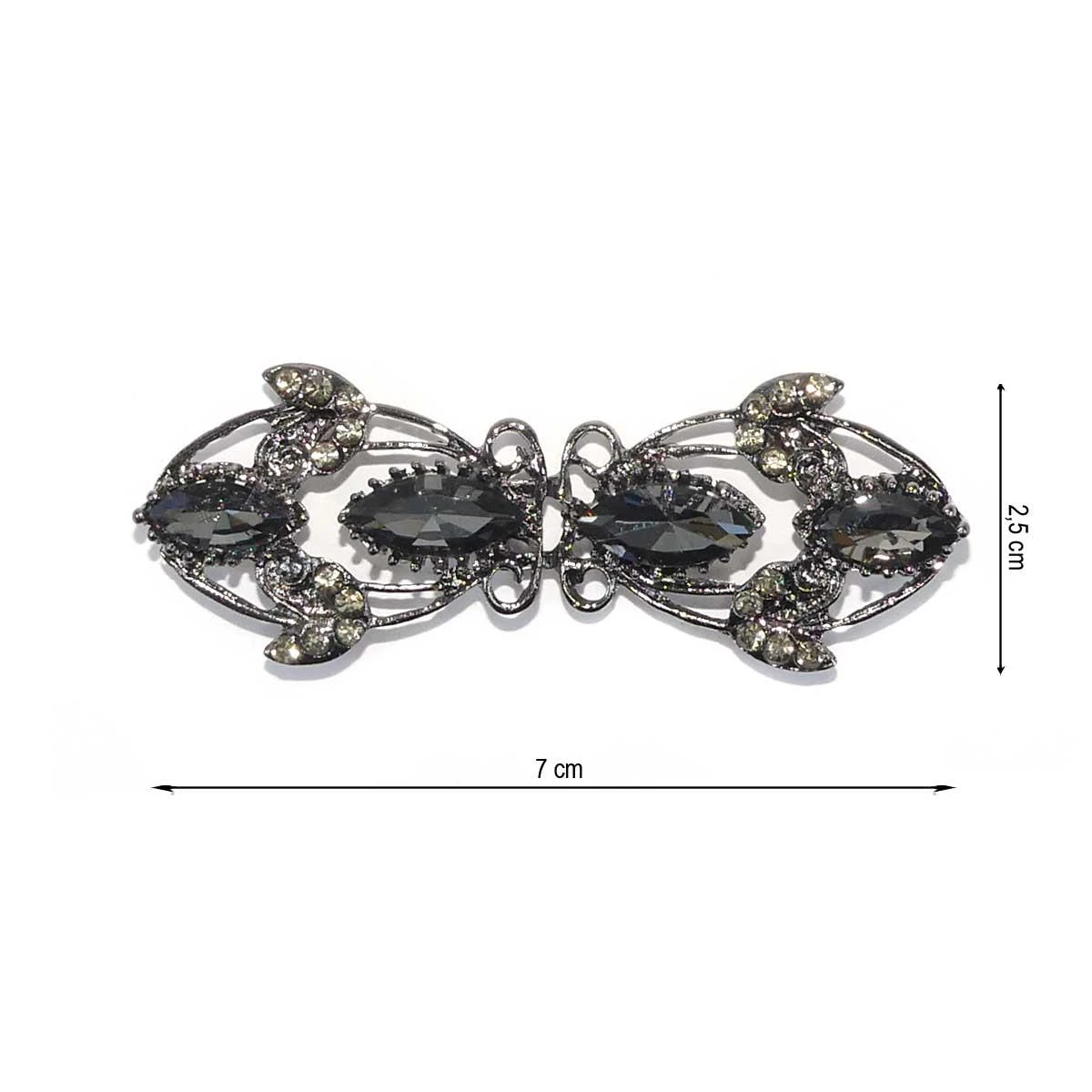 Broche o cierre de fantasía, metalizado con piezas de strass y cristal con diseño renacentista en color pavonado. Tiene una longitud de 7cm y un ancho de 2,5cm.