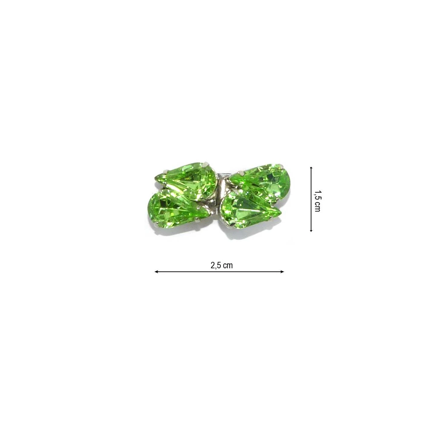 Broche o cierre de fantasía, metalizado con piezas de cristal de color en forma de lágrimas formando el conjunto en su interior. Tiene una longitud de 2,5cm y un ancho de 1,5cm. Seleccionar el color deseado a continuación.