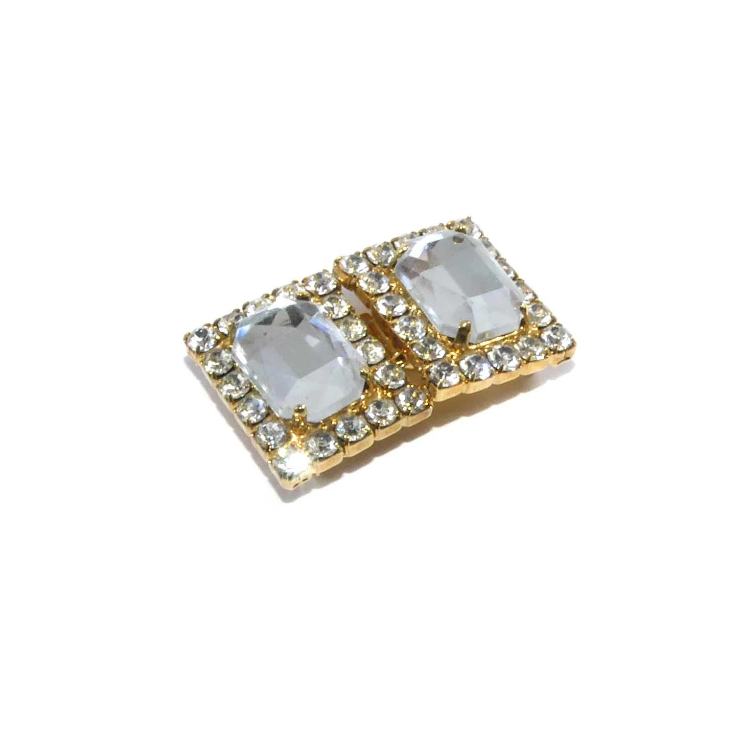 Broche de metal dorado con forma rectangular cada parte y pequeñas piezas de strass junto con una grande al centro, incorporadas en el diseño. Tiene una longitud de 3cm y un ancho de 2cm.