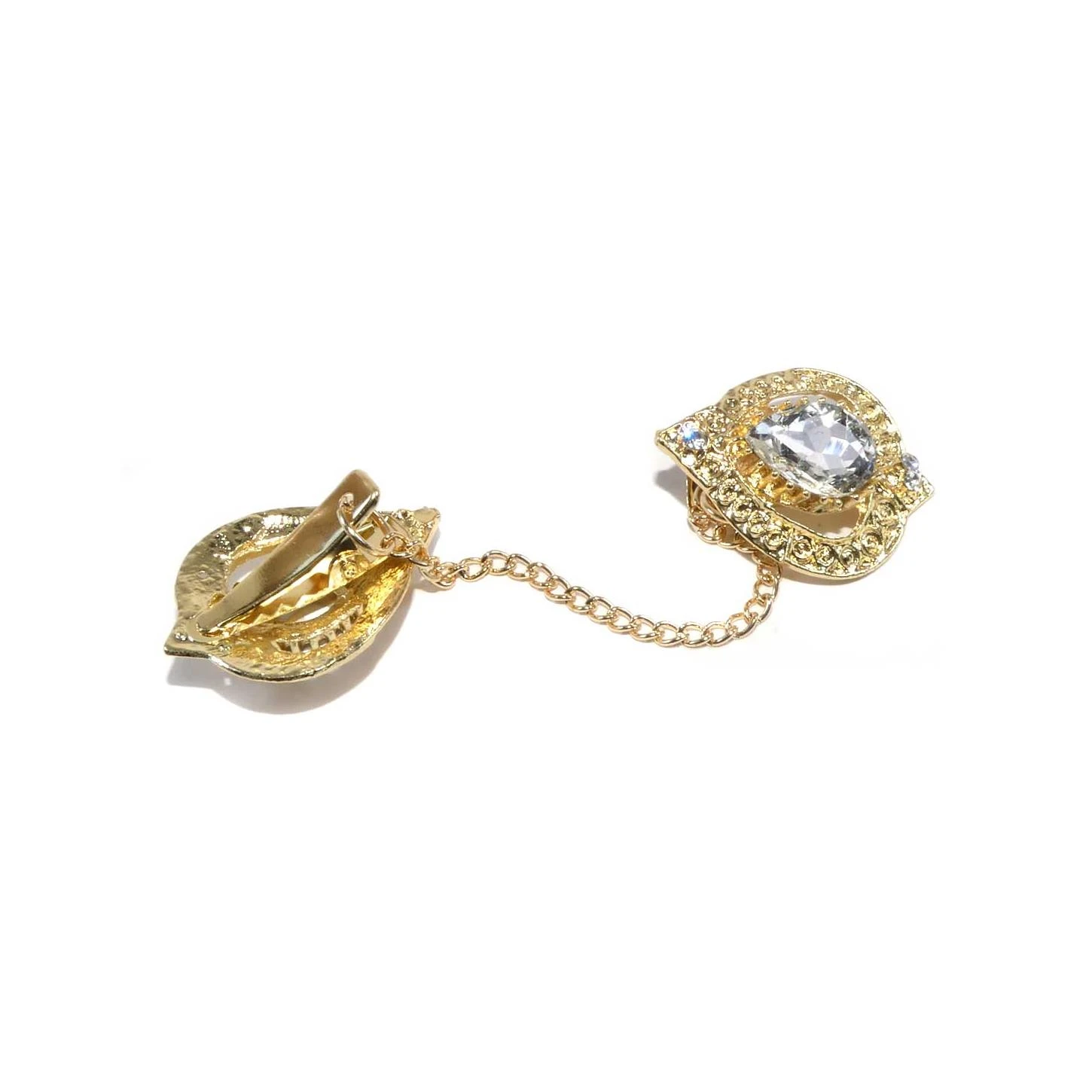 Broche metálico y pieza de cristal, con pinzas como sujección sin necesidad de coser. Con precioso dibujo y una vez cerrado completa una longitud de 9cm. Tiene un ancho de 2,5cm y una cadena de unión entre parte y parte.