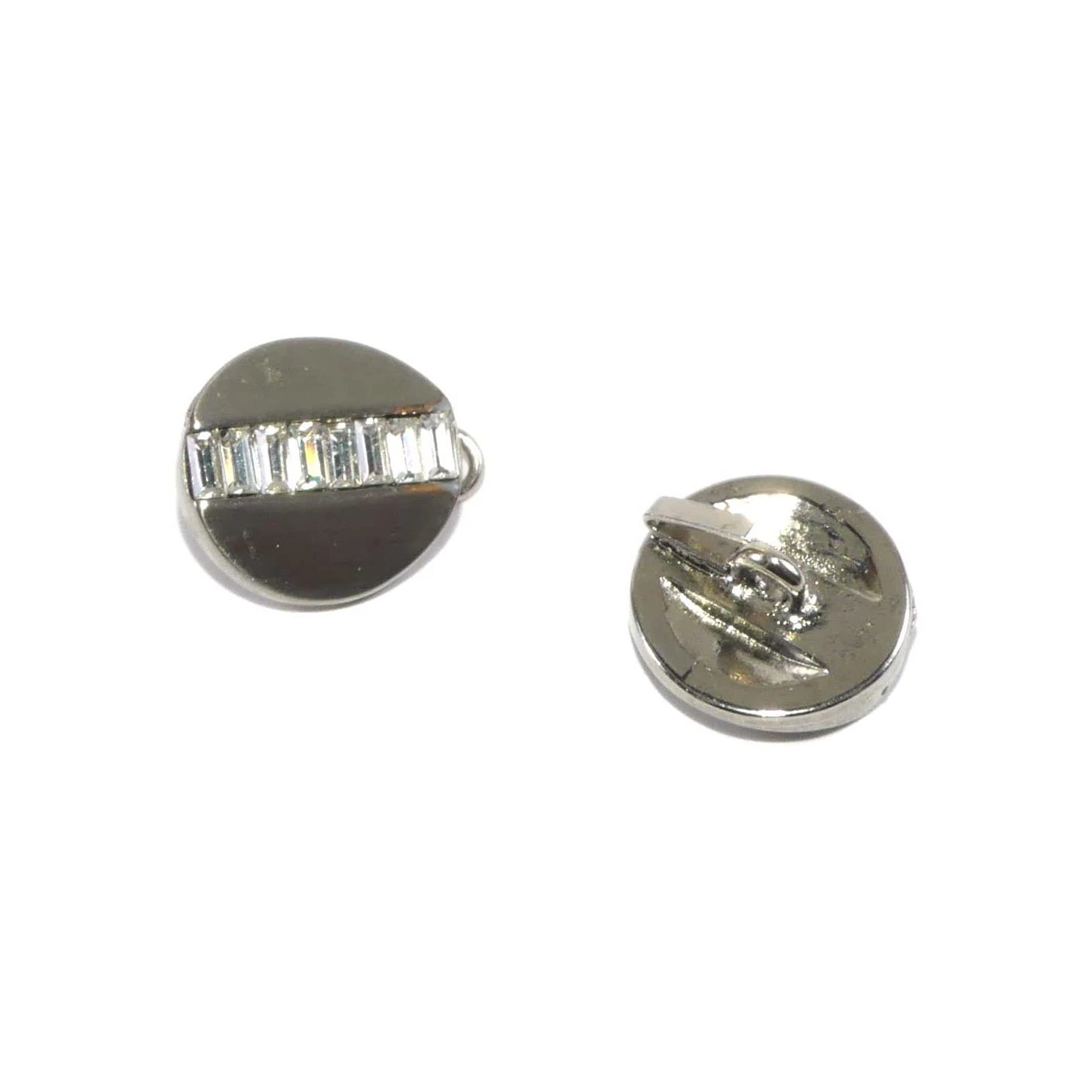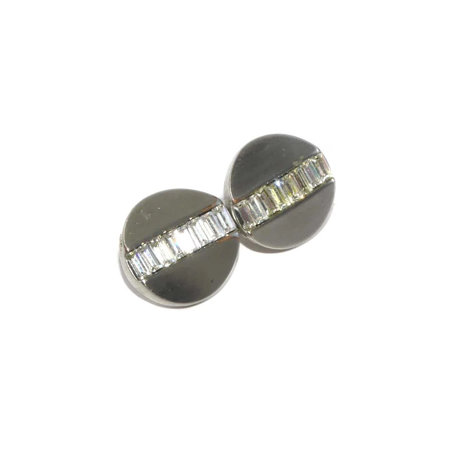 Broche o cierre de fantasía, metalizado en plata con forma redonda cada parte y una línea de cristal al centro como parte del diseño. Tiene una longitud de 3,5cm y un ancho de 1,8cm.